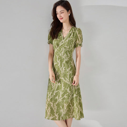 Avocado Green Chiffon Printed Tea V-neck Dress
