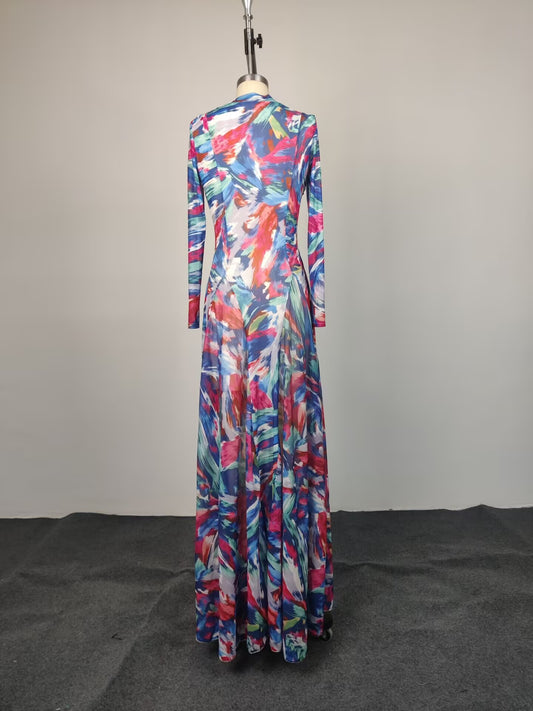 Multicolor Abstract Print Long Sleeve Maxi Dress
