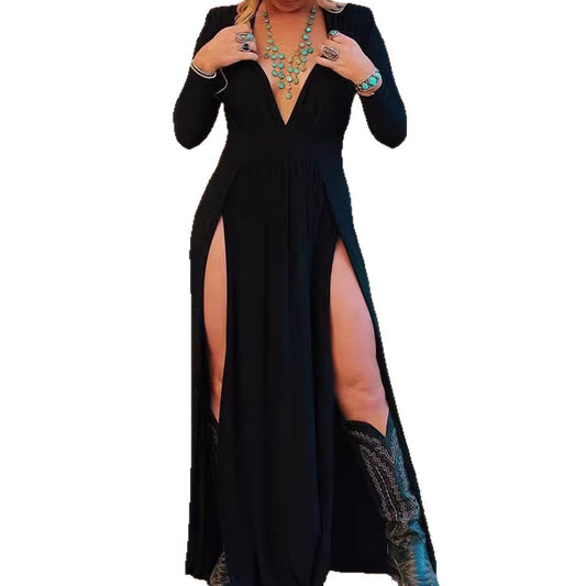 Long-sleeve V-neck Solid-color Hollow-out Dress