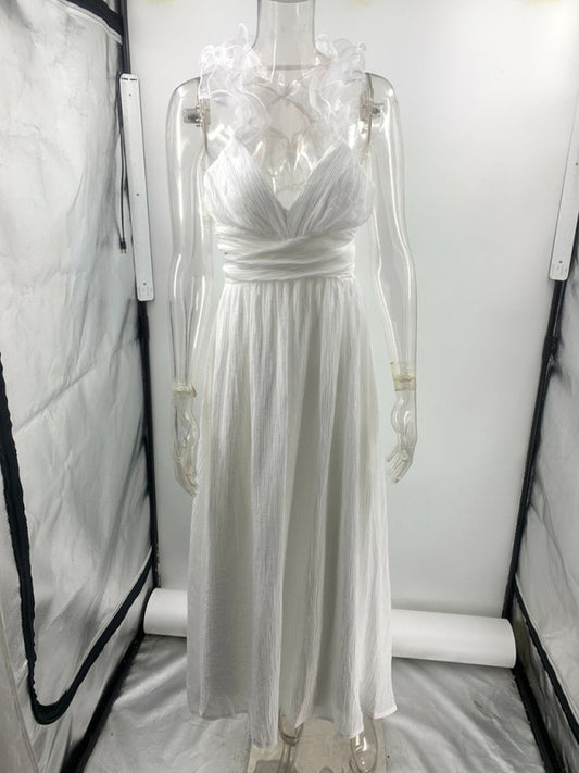 New Adjustable Gold Buckle Halter Neck Braided Pleated Dress