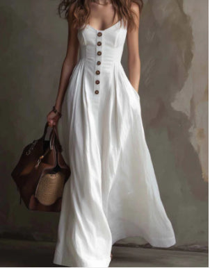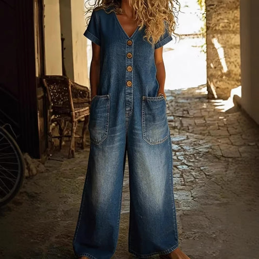 Womens Retro Summer Cotton-Linen Button-Pocket Comfortable Short-Sleeve Casual