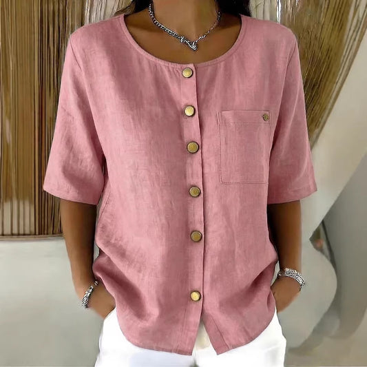 Womens Crew-Neck Shirt With Metal Buttons And Three-Quarter Sleeves