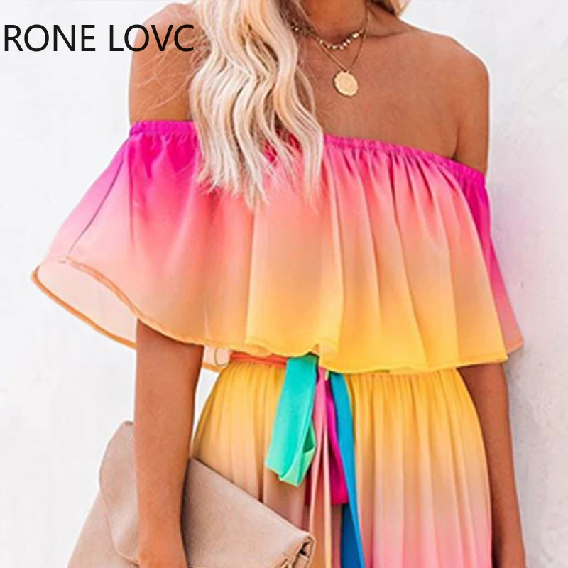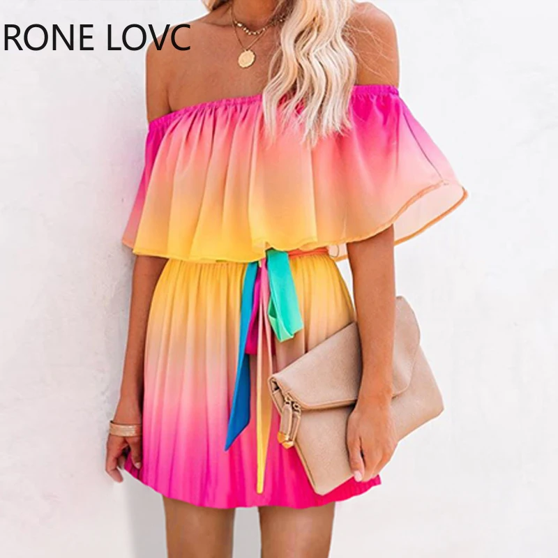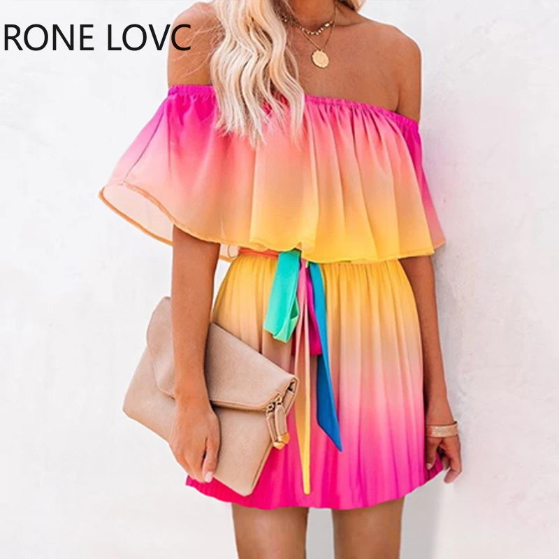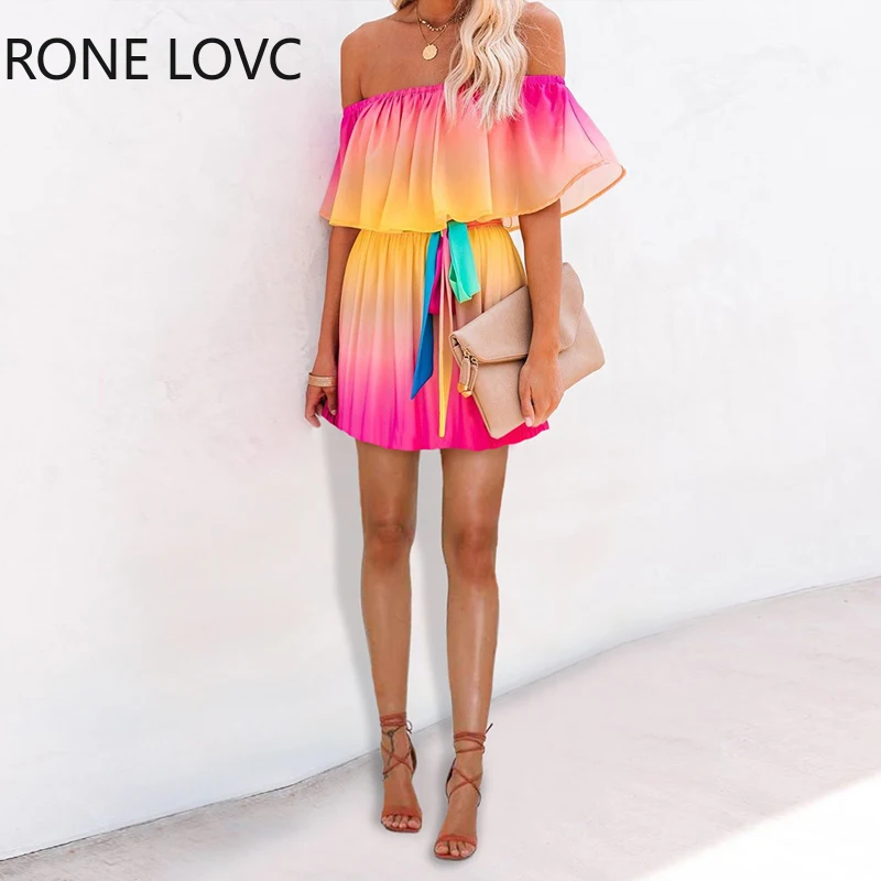 Chic Gradient Colour Tie-Dye Off-Shoulder Ruffles Mini Dress