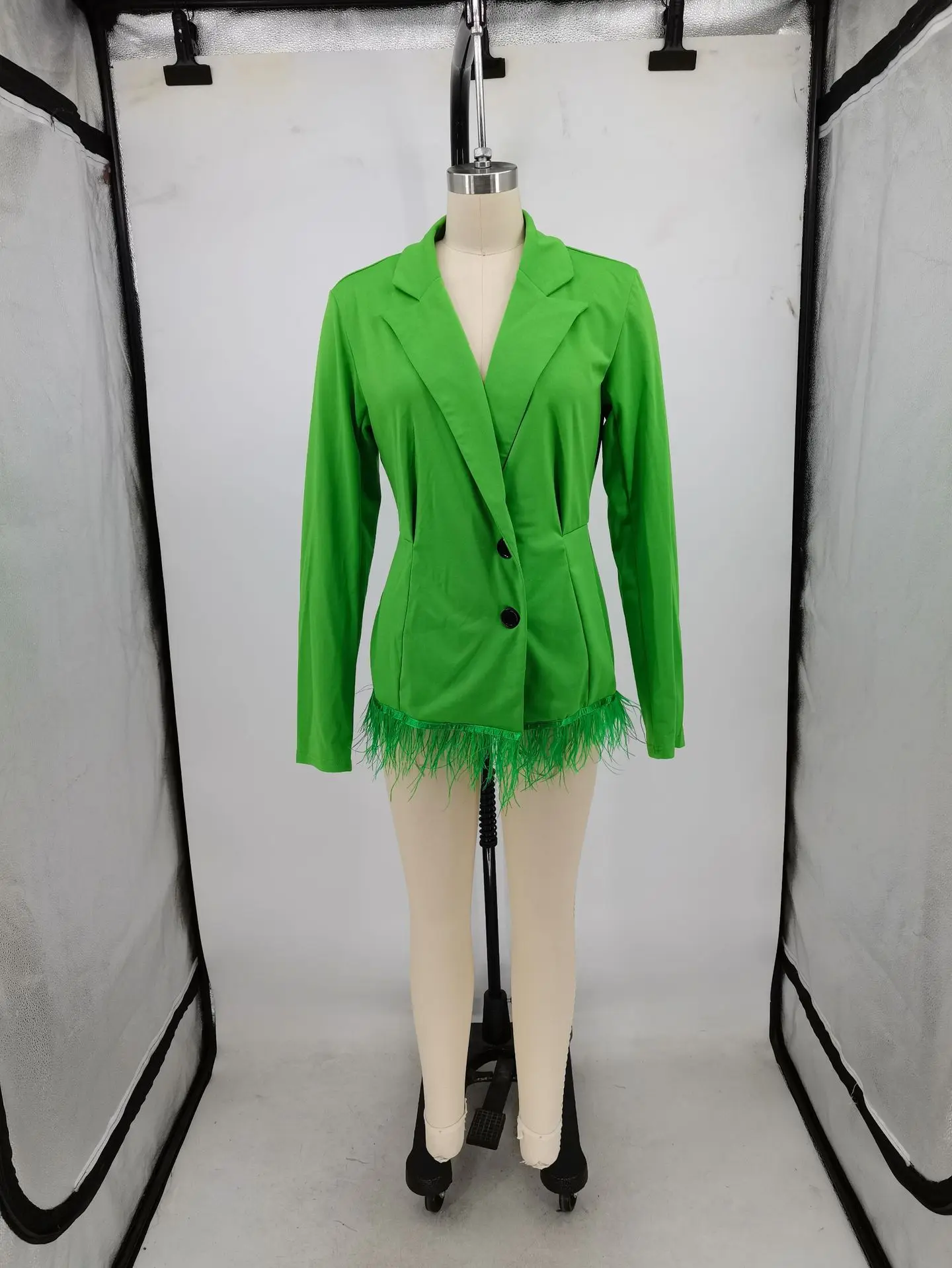 CM YAYA Elegant Long-Sleeve Notched Neck Feather Tassel Hem Blazer-Style Dress