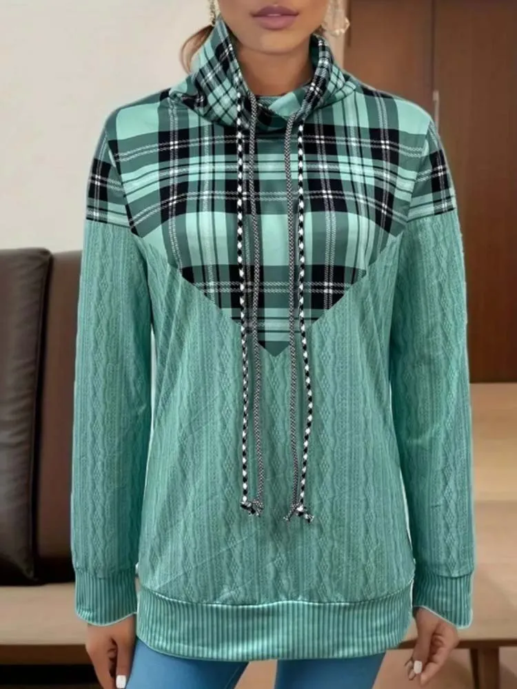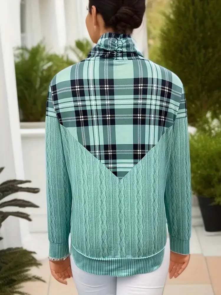 Patchwork Plaid High-Neck Long-Sleeve T-Shirt