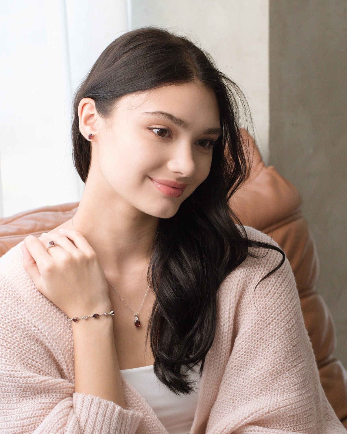 This captivating bracelet features natural ganets - the beautiful deep red gemstones - and is adorned with sparkly simulated diamonds. The timeless and elegant design is perfect for adding sparkle to your outfit and will make a great gift for your loved ones.