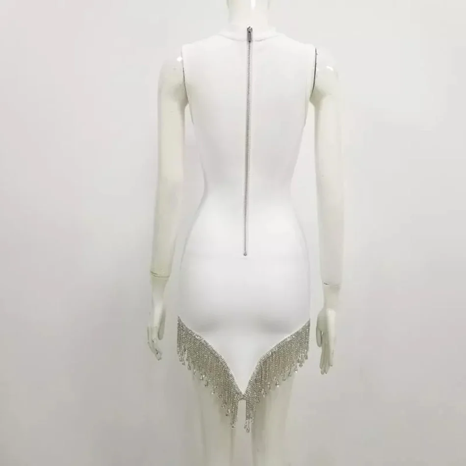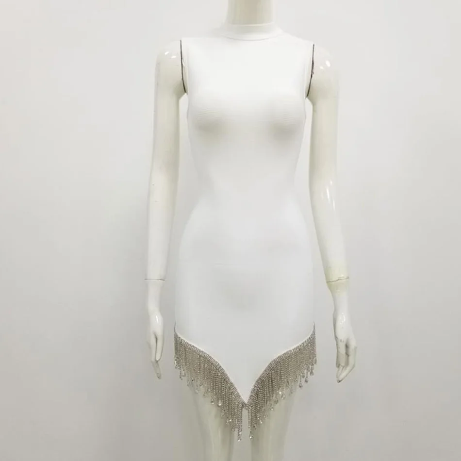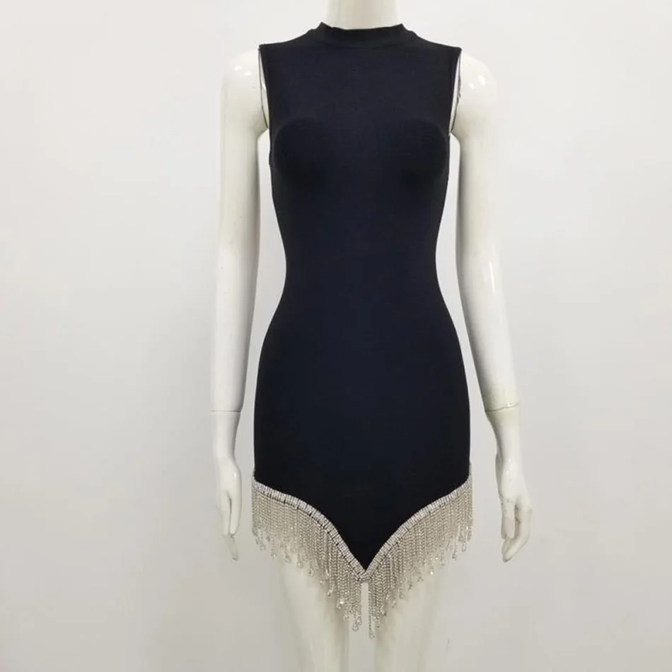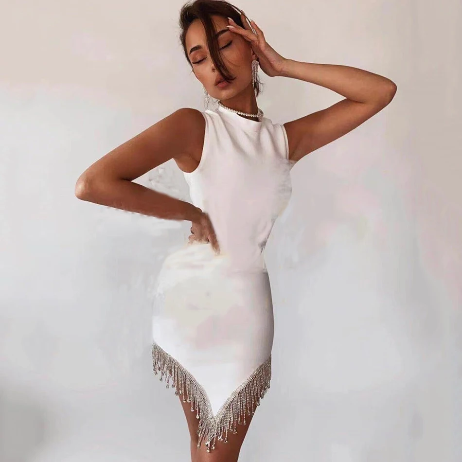 High-Quality Sleeveless O-Neck Tassel Diamond Bandage Party Mini Dress