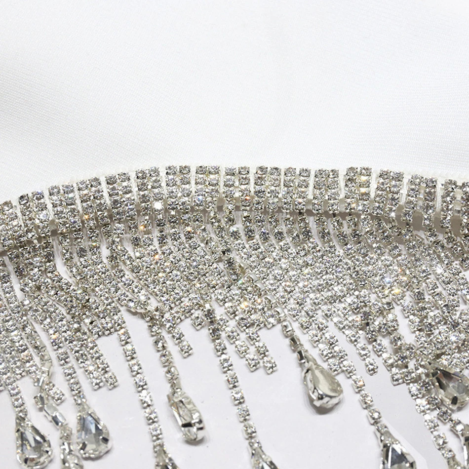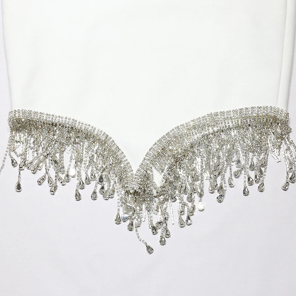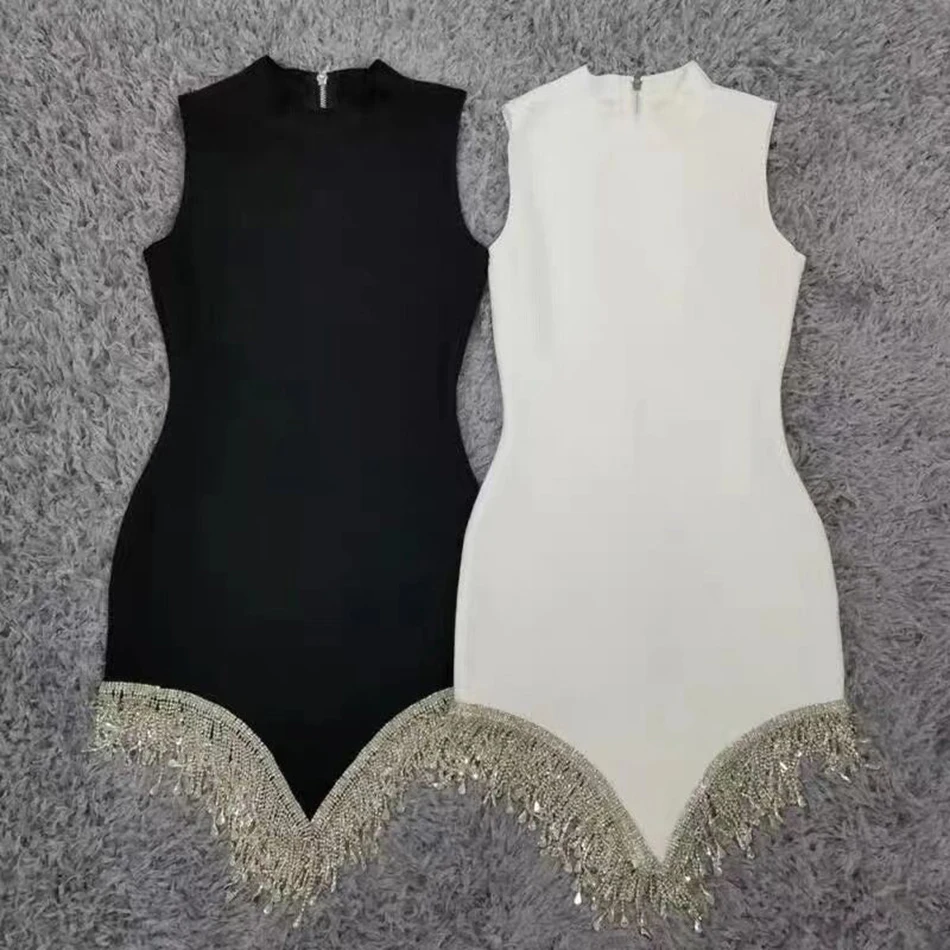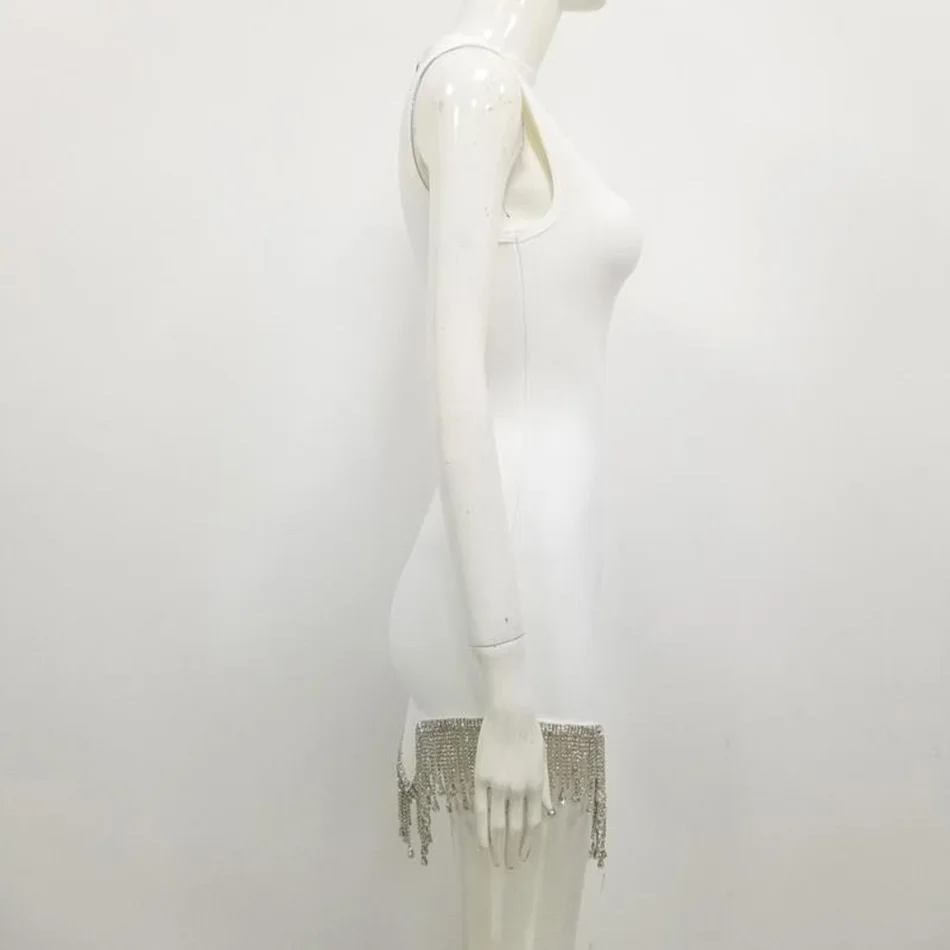 High-Quality Sleeveless O-Neck Tassel Diamond Bandage Party Mini Dress