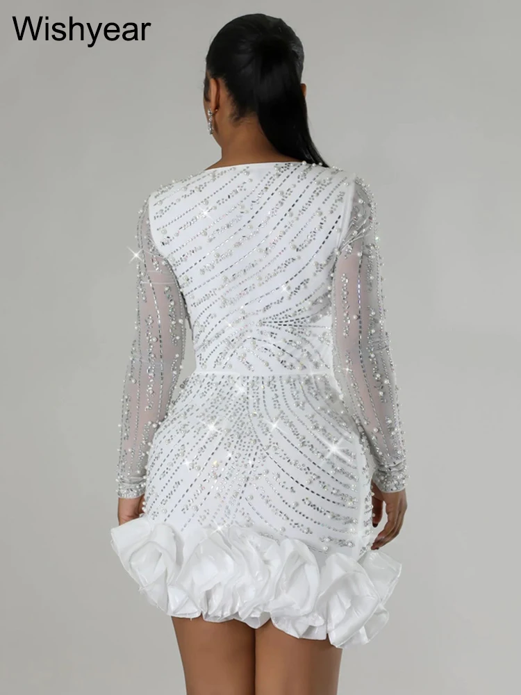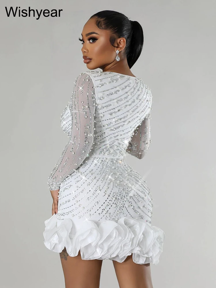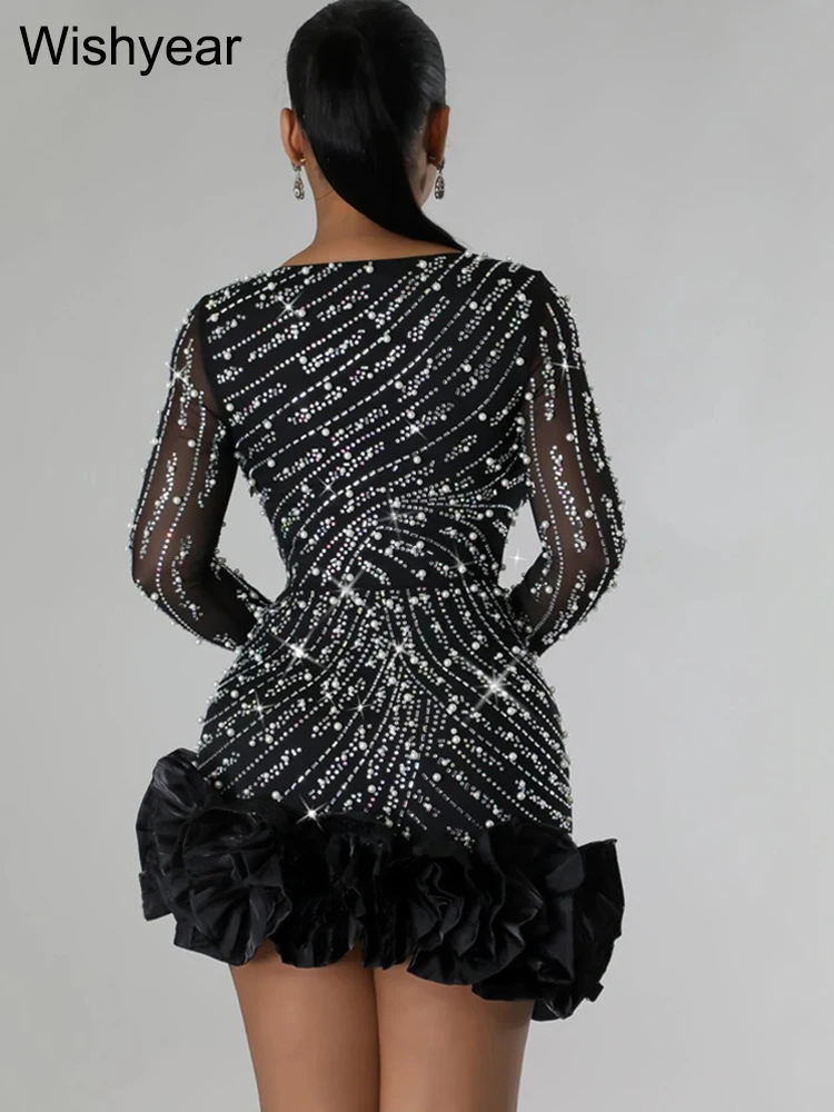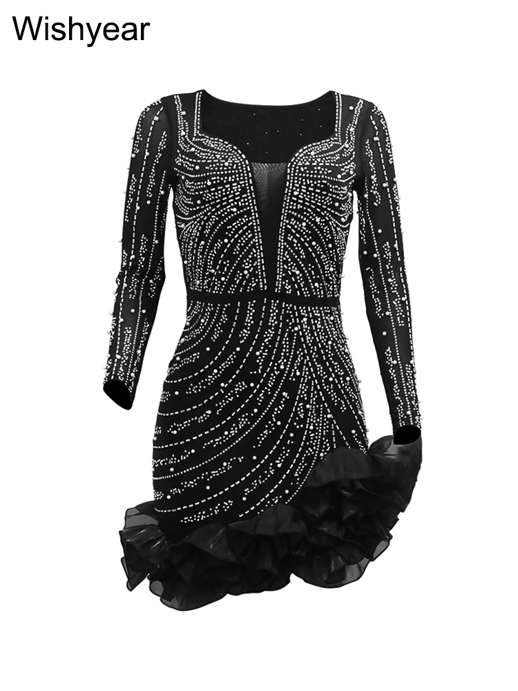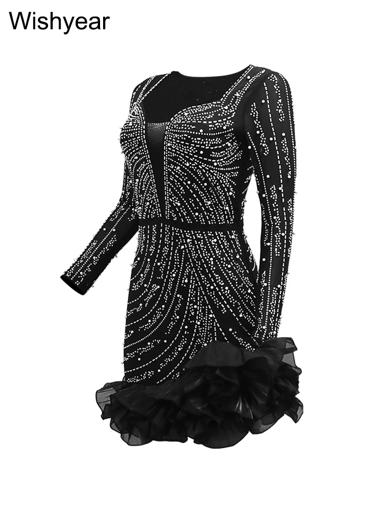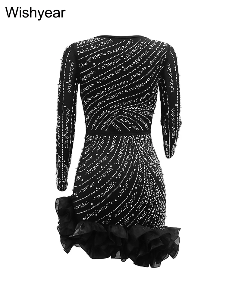 Luxury Evening Rhinestone Pearls Bodycon Ruffle Mini Dress