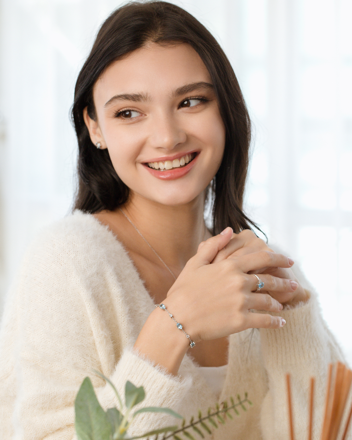 The perfect starter set for blue gemstone lovers, this jewellery set comprises a bracelet and a pair of matching stud earrings. Each piece has been meticulously handcrafted with sky blue topaz - the light blue gemstone. The bracelet is also adorned with sparkly simulated diamonds. This jewellery set will make the perfect Christmas gift, birthday gift and anniversary gift for your loved ones.
