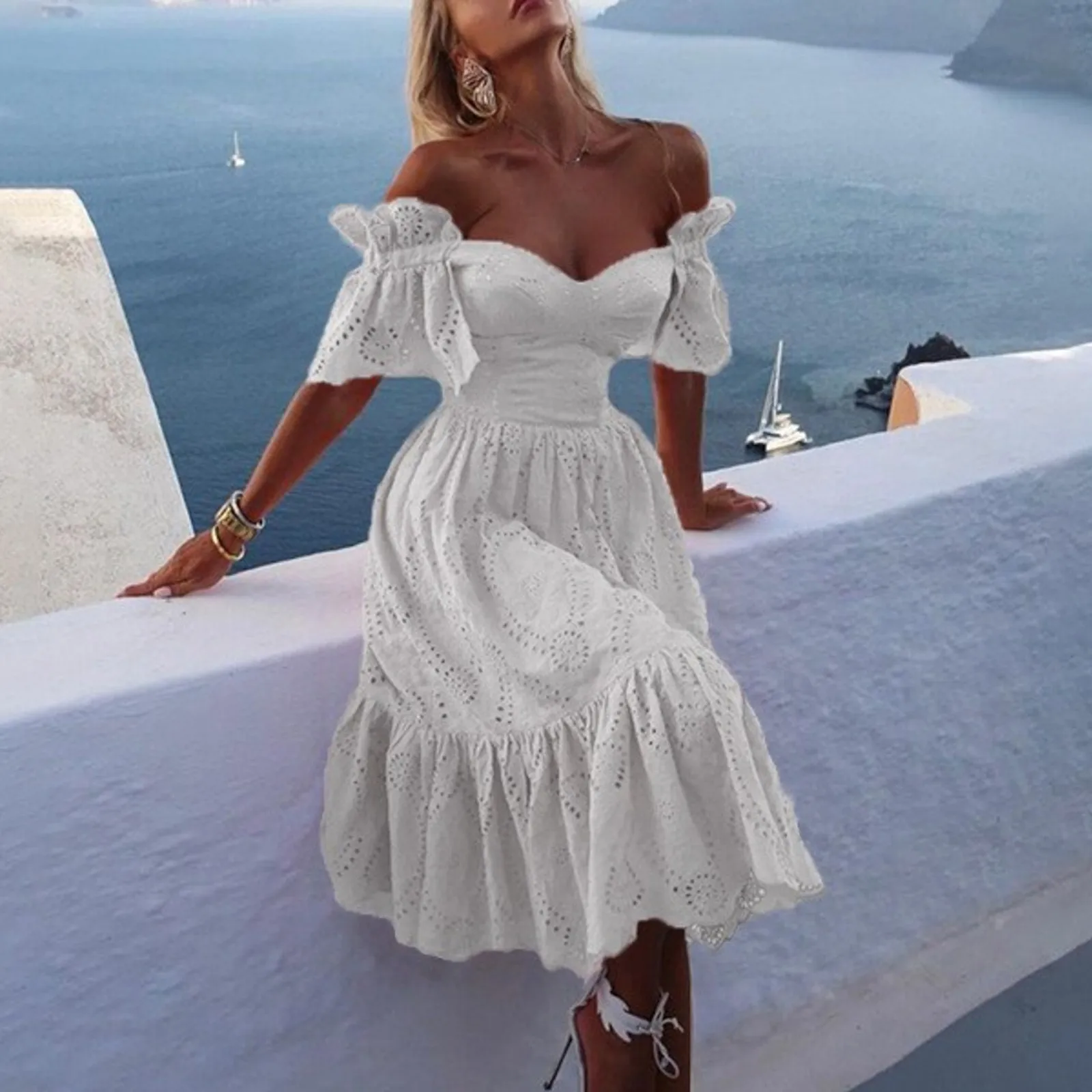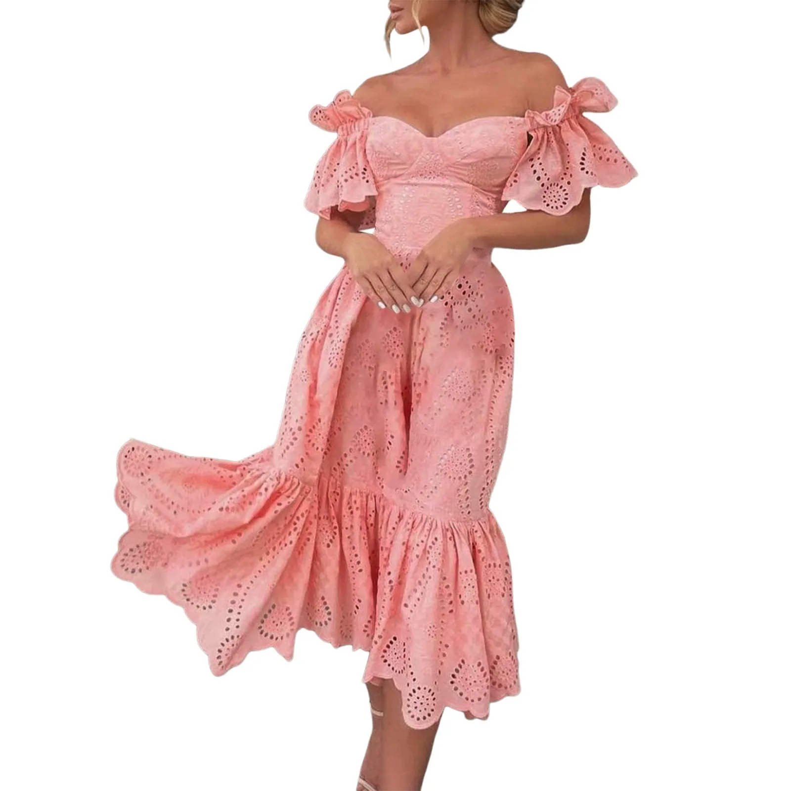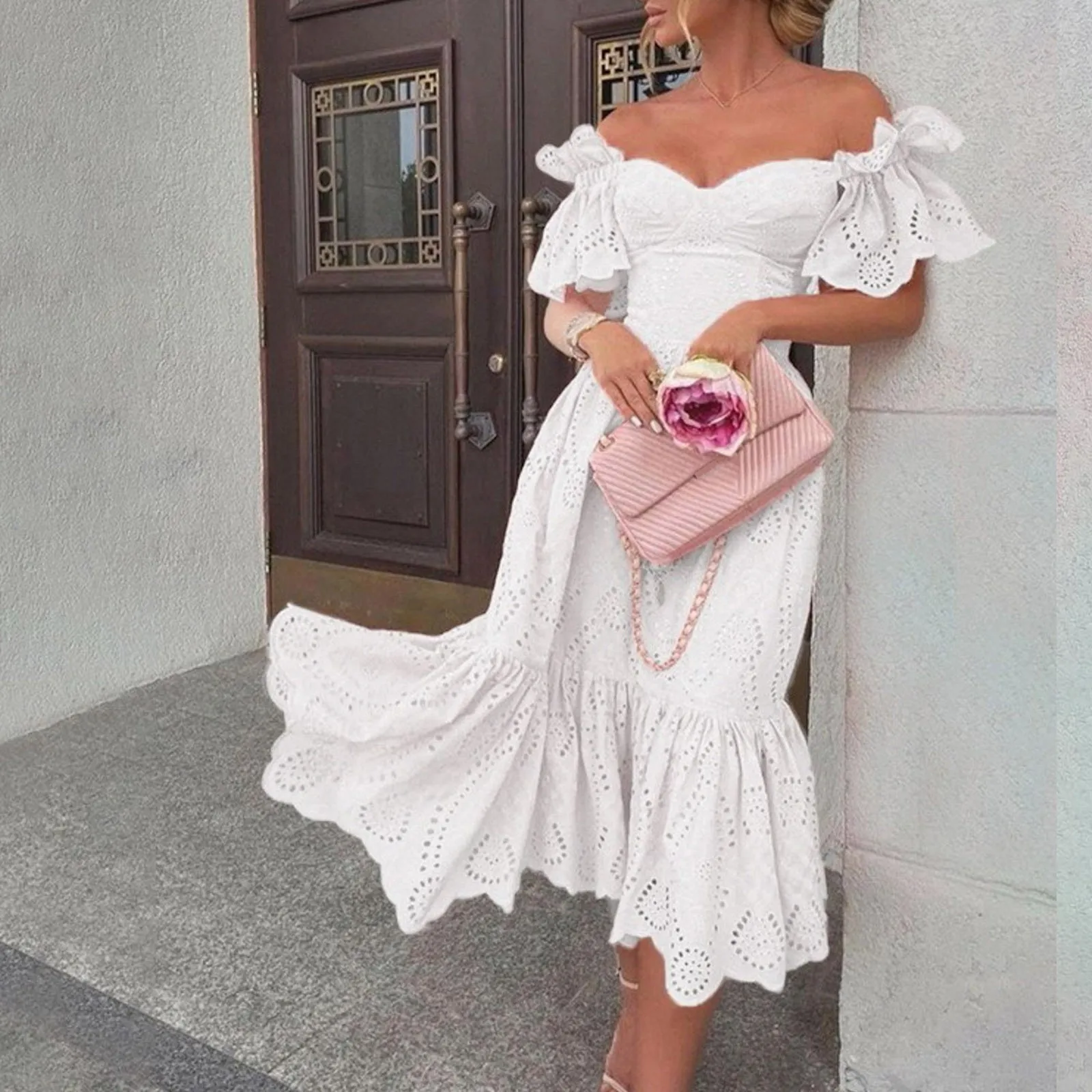 Off-Shoulder Ruffled Solid-Colour Hollow-Out Dress