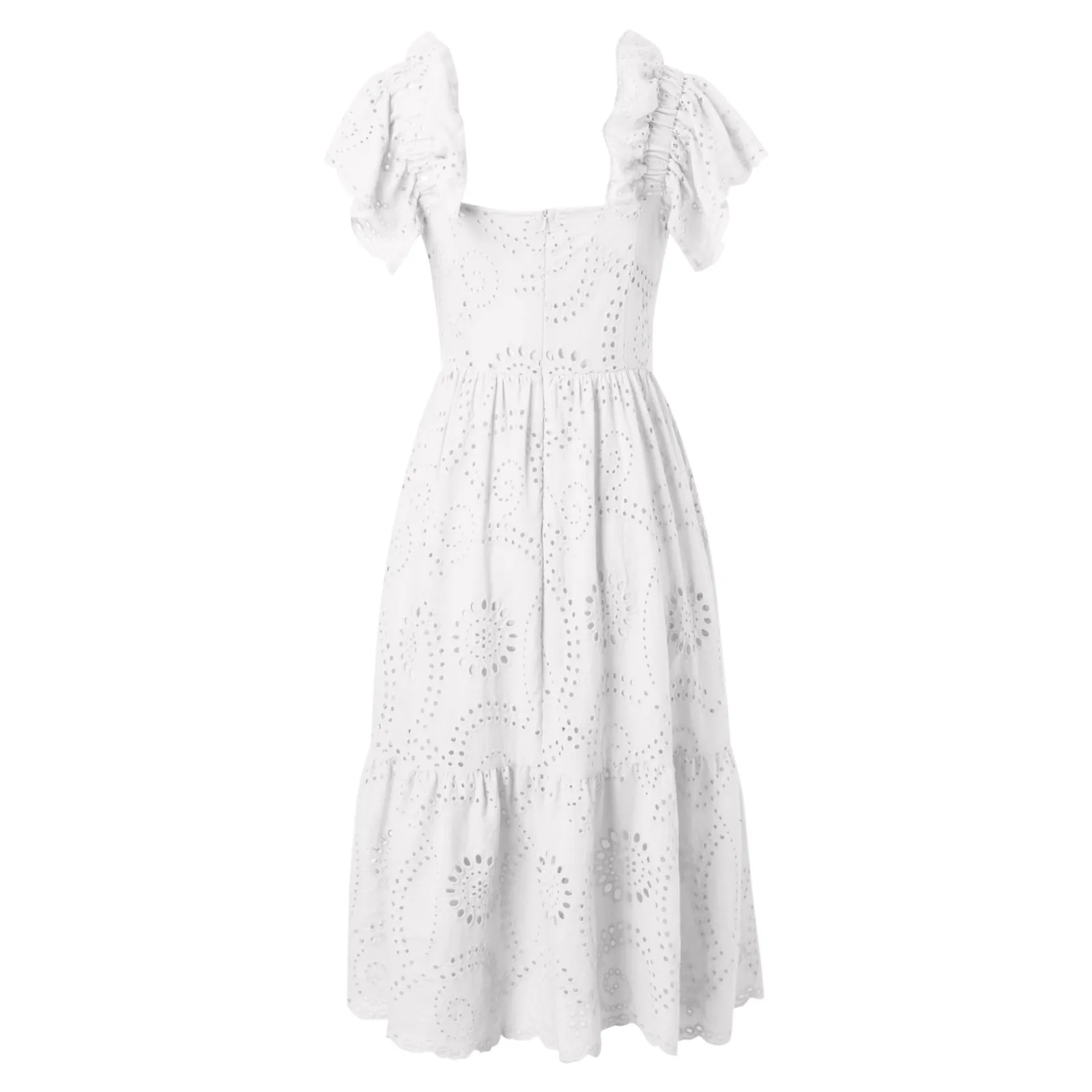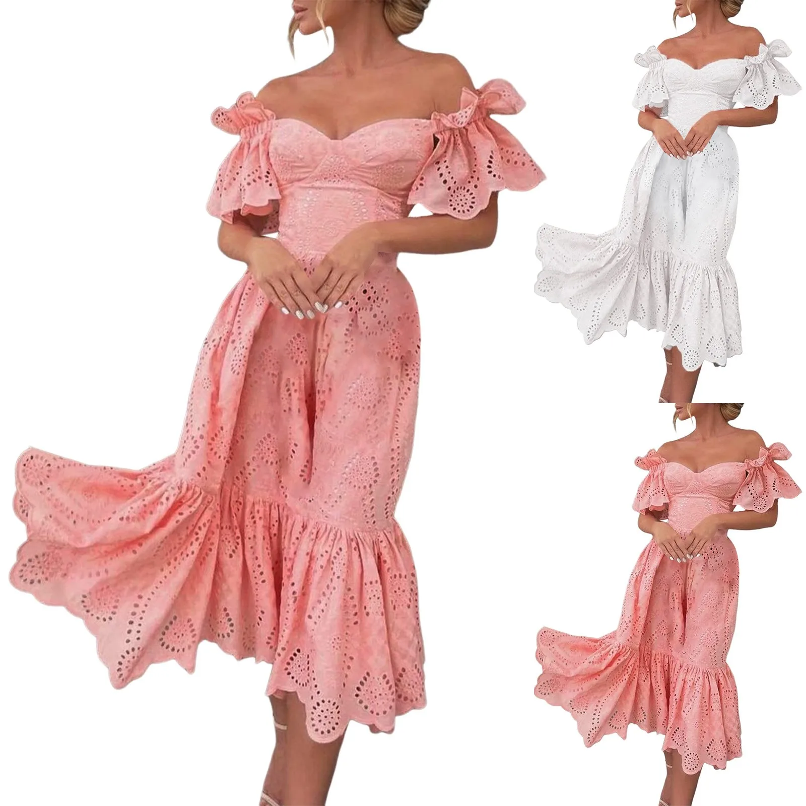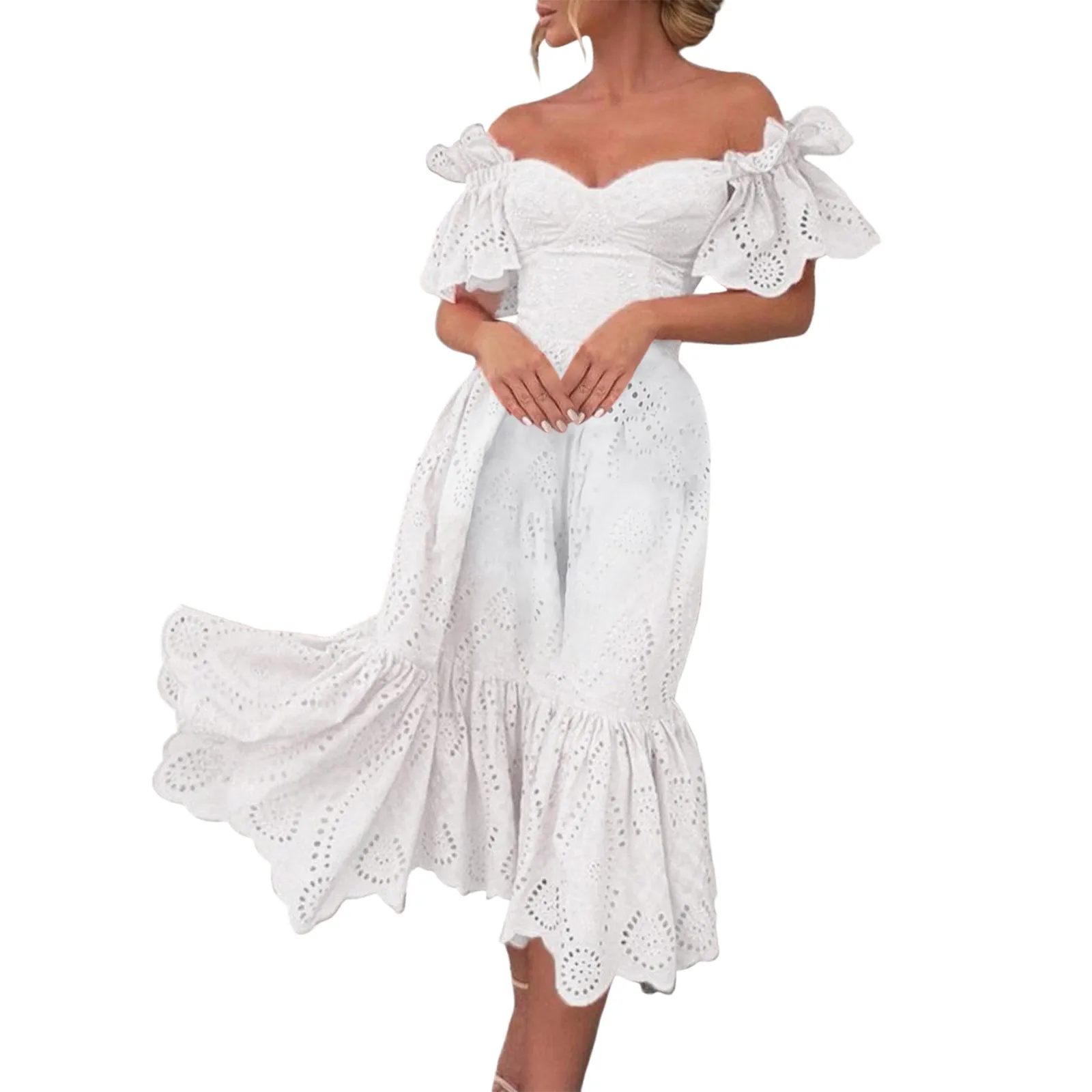Off-Shoulder Ruffled Solid-Colour Hollow-Out Dress