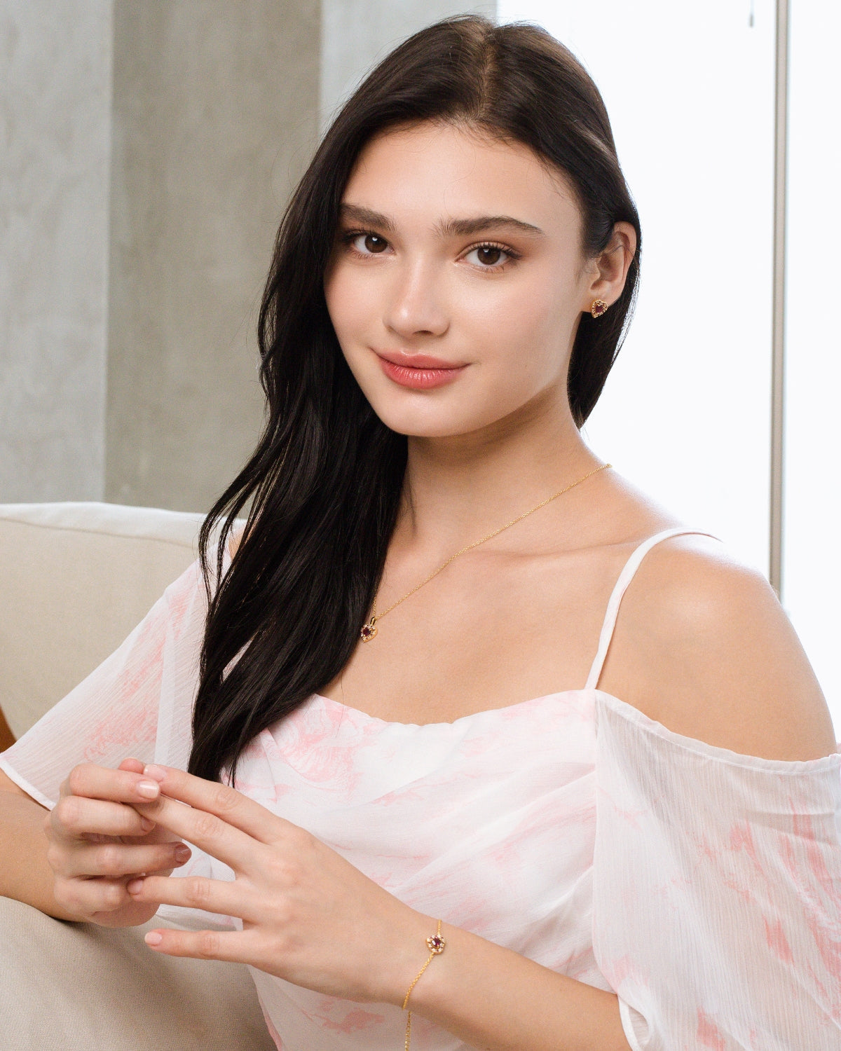 These beautiful bracelet will make your heart flutter. Crafted in a unique double heart design, the bracelet features a heart-shaped rhodolite garnet - the stunning raspberry red gemstone in the centre and adorned the second layer of heart, made with pink rhodolites and simulated diamonds.