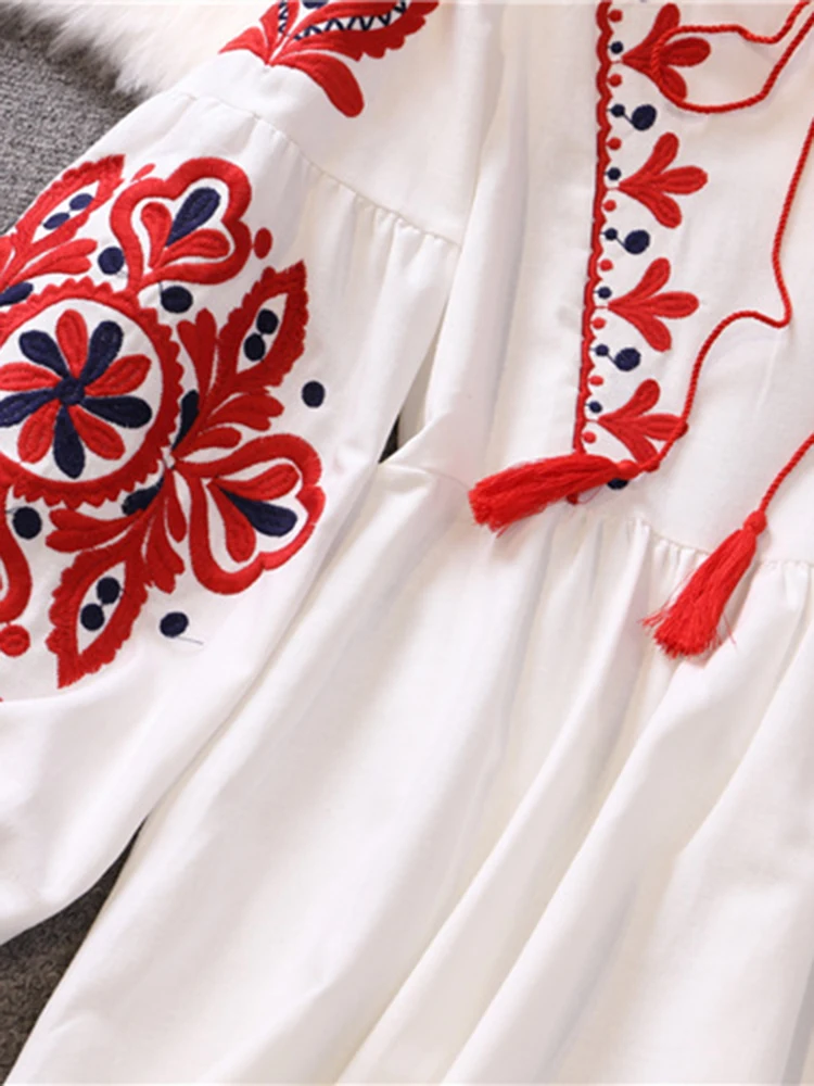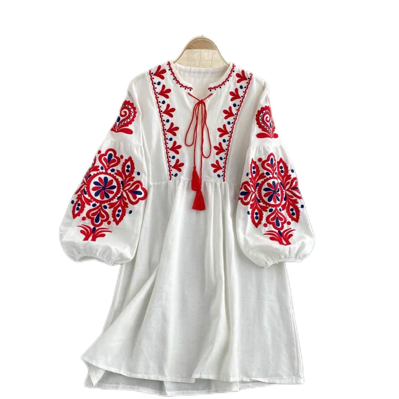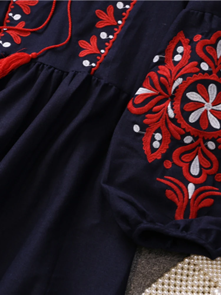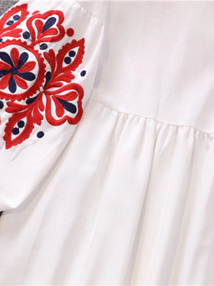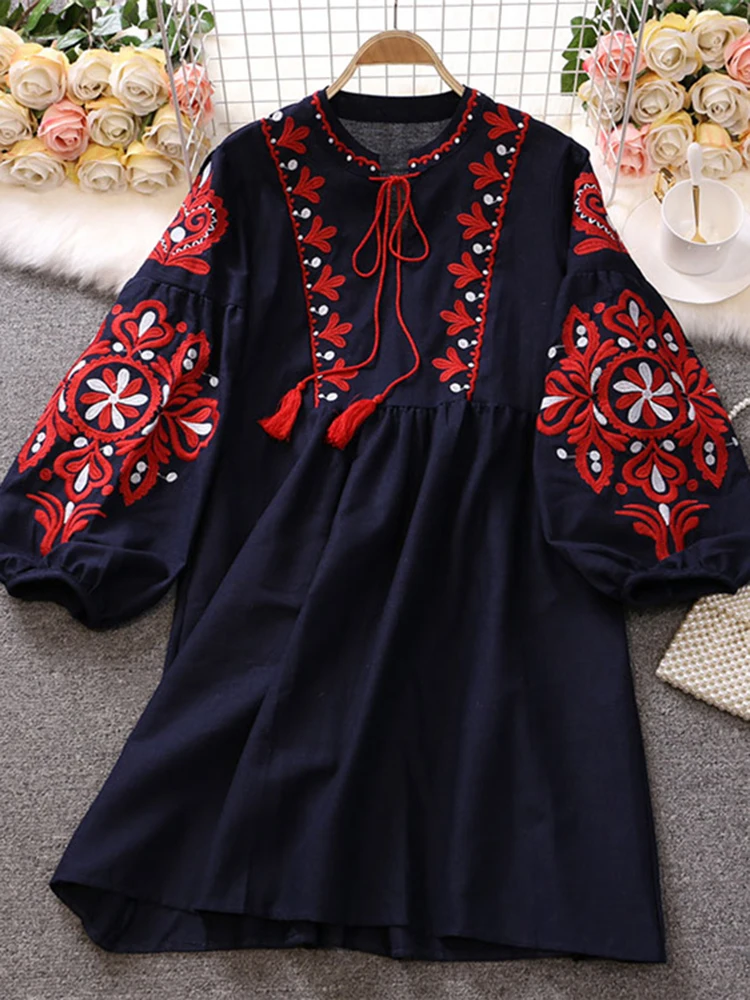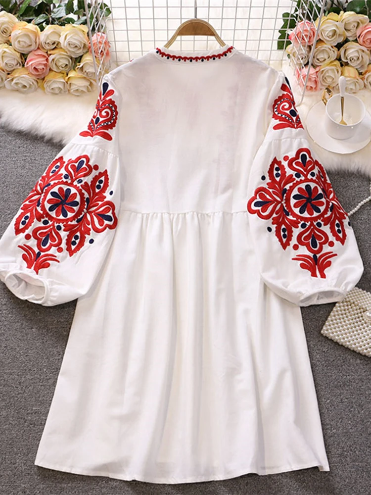Retro Ethnic Embroidered Dress - Lantern Sleeves Bohemian Holiday Dress