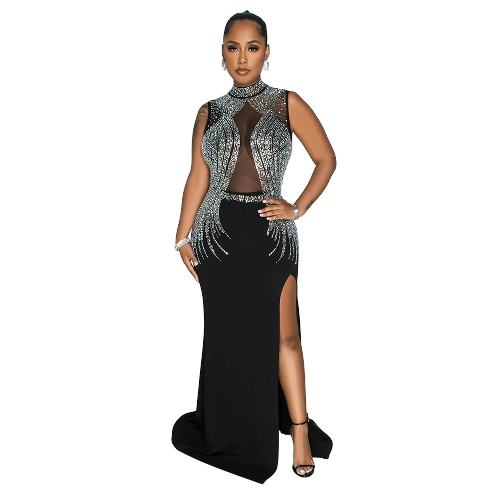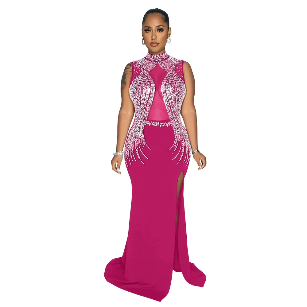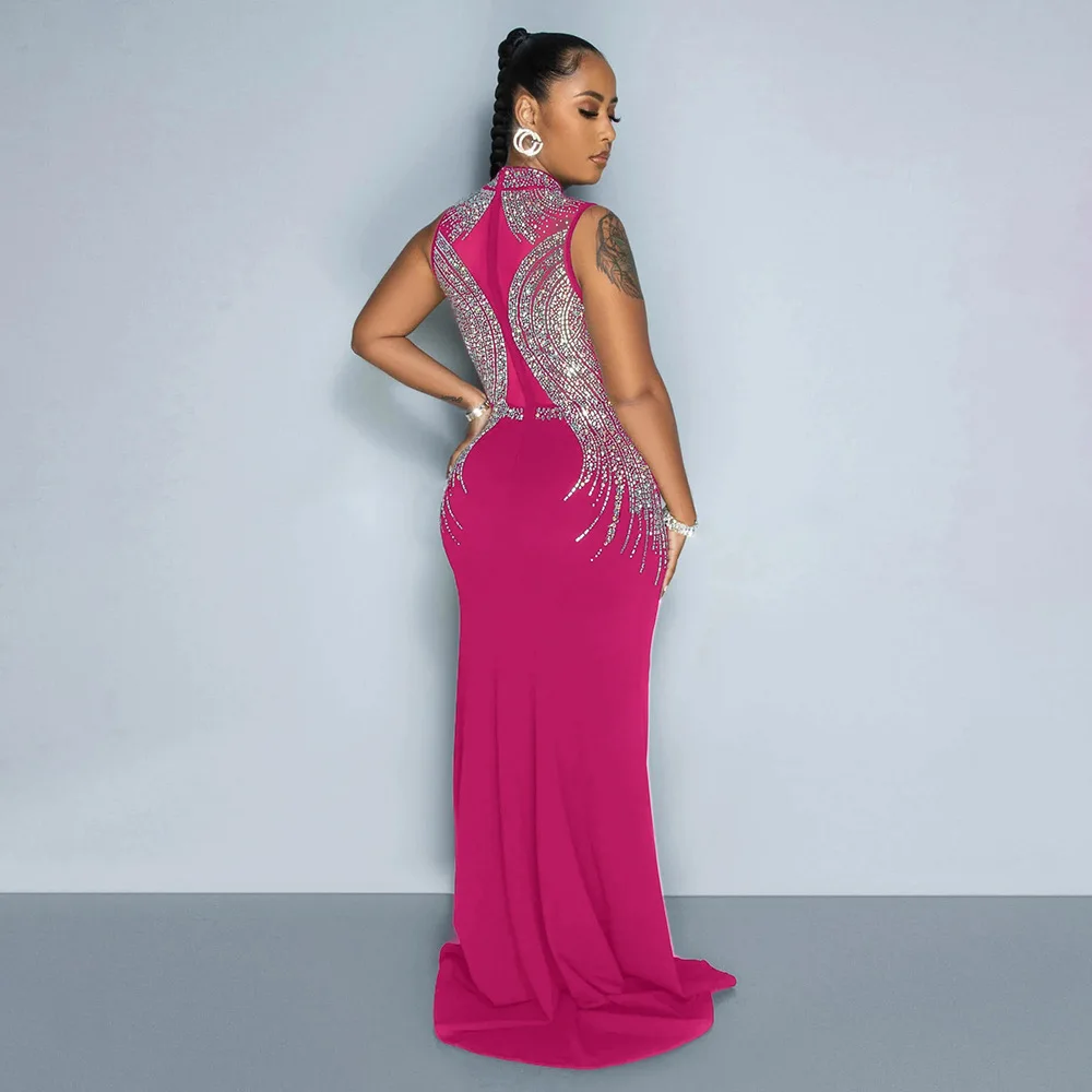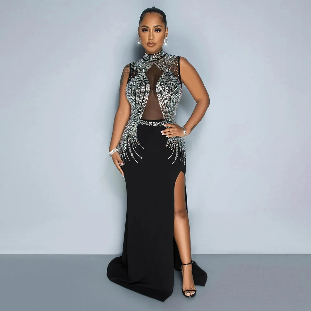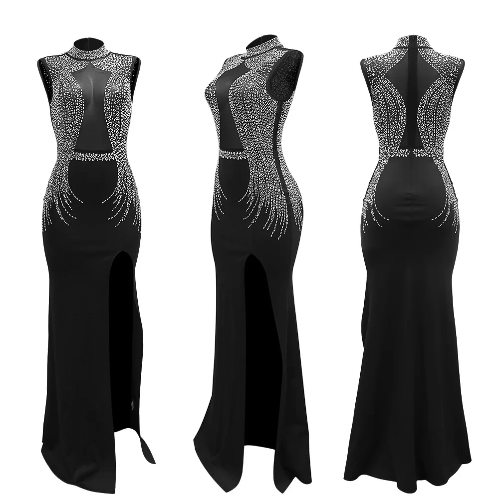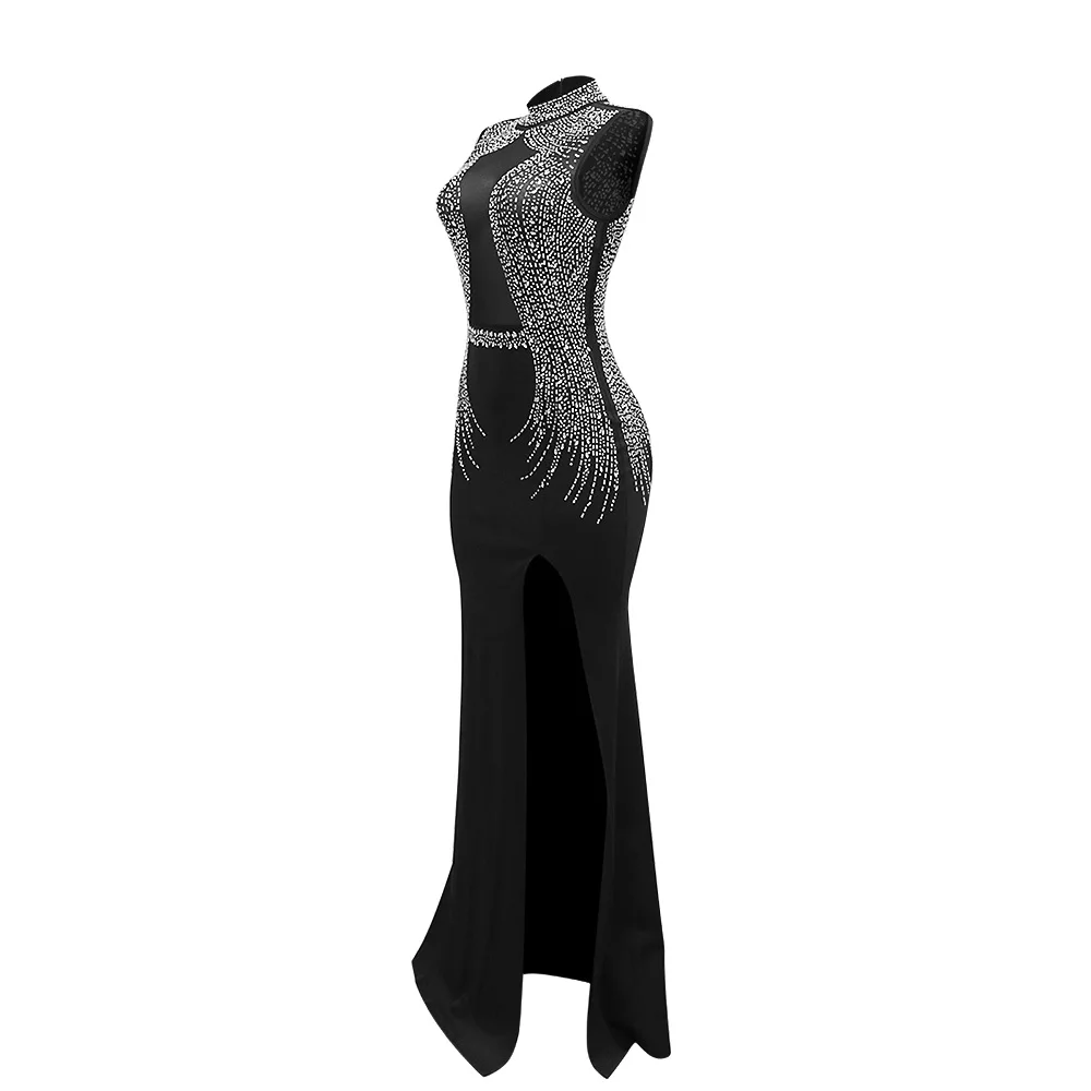 Round-Neck High-Slit Solid-Colour Hot Diamond Party Long Dress