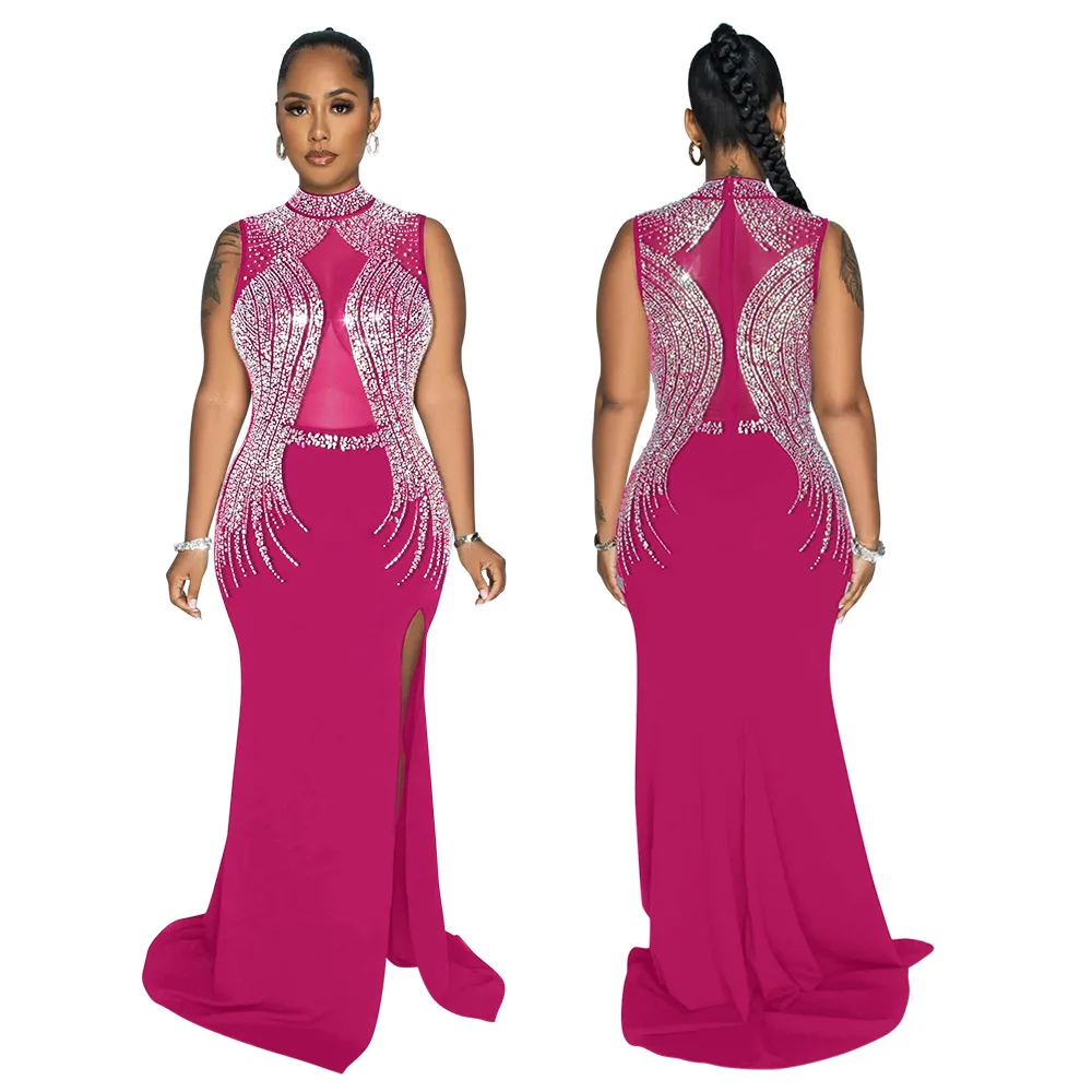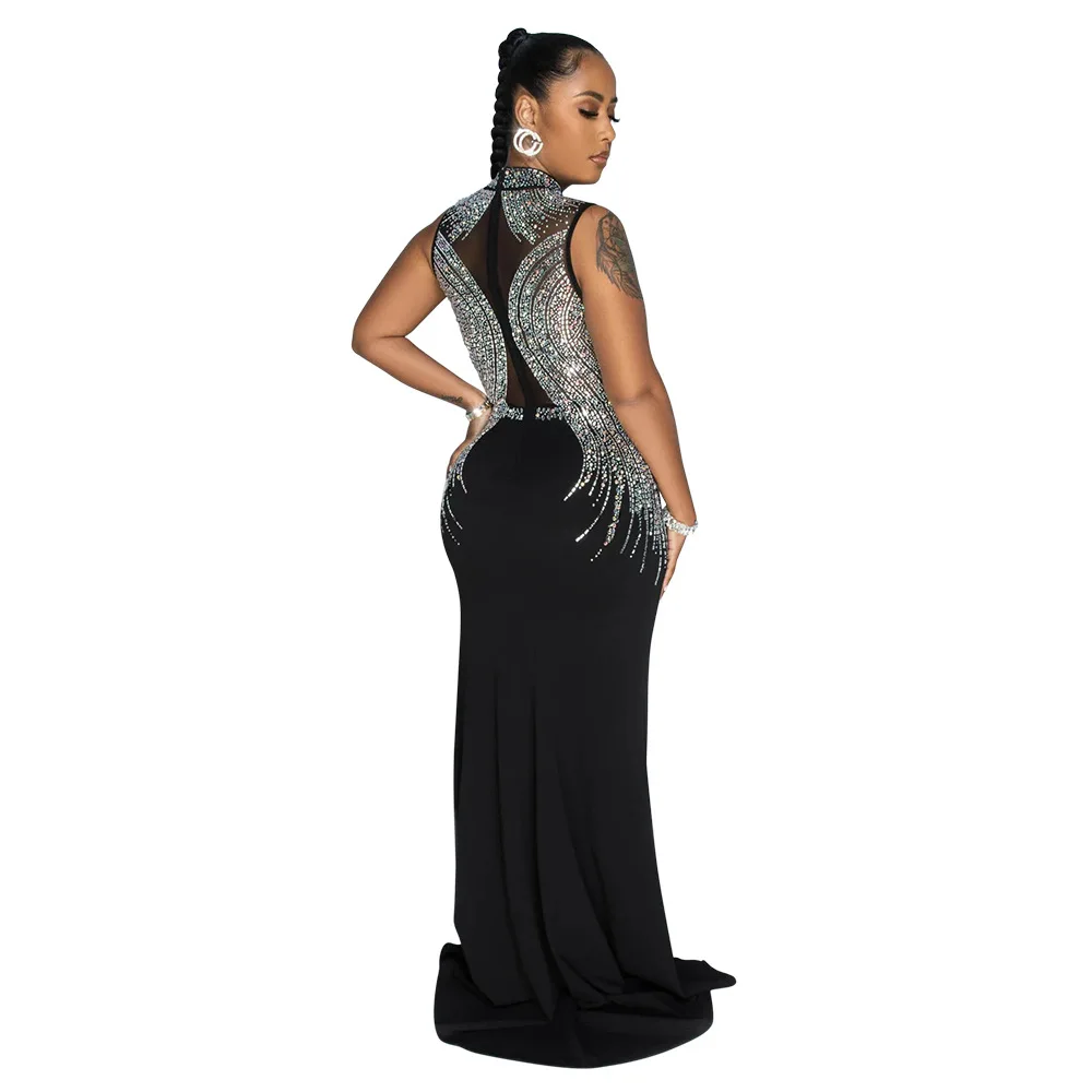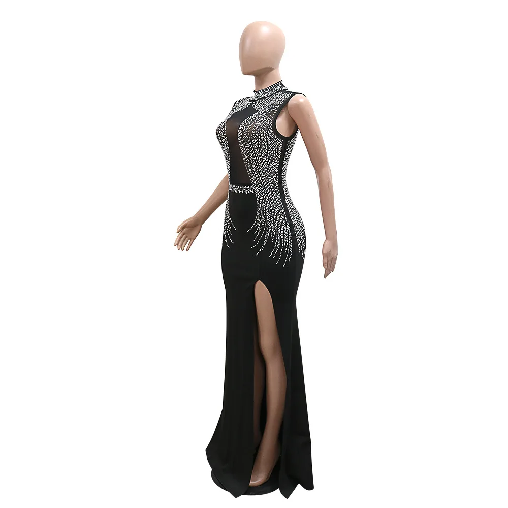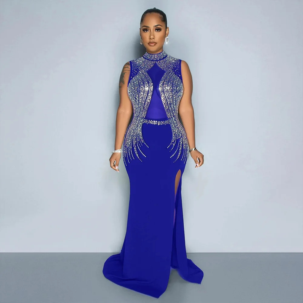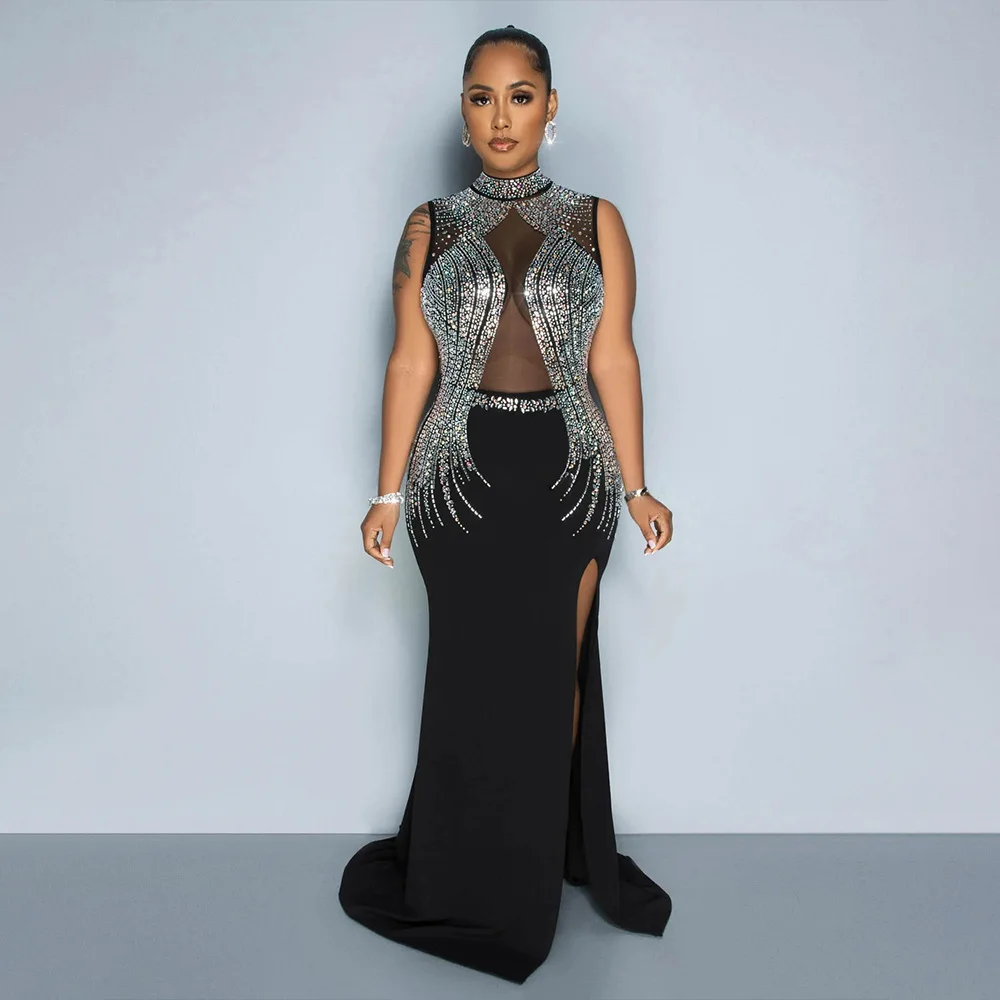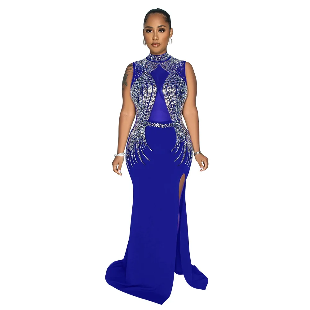 Round-Neck High-Slit Solid-Colour Hot Diamond Party Long Dress