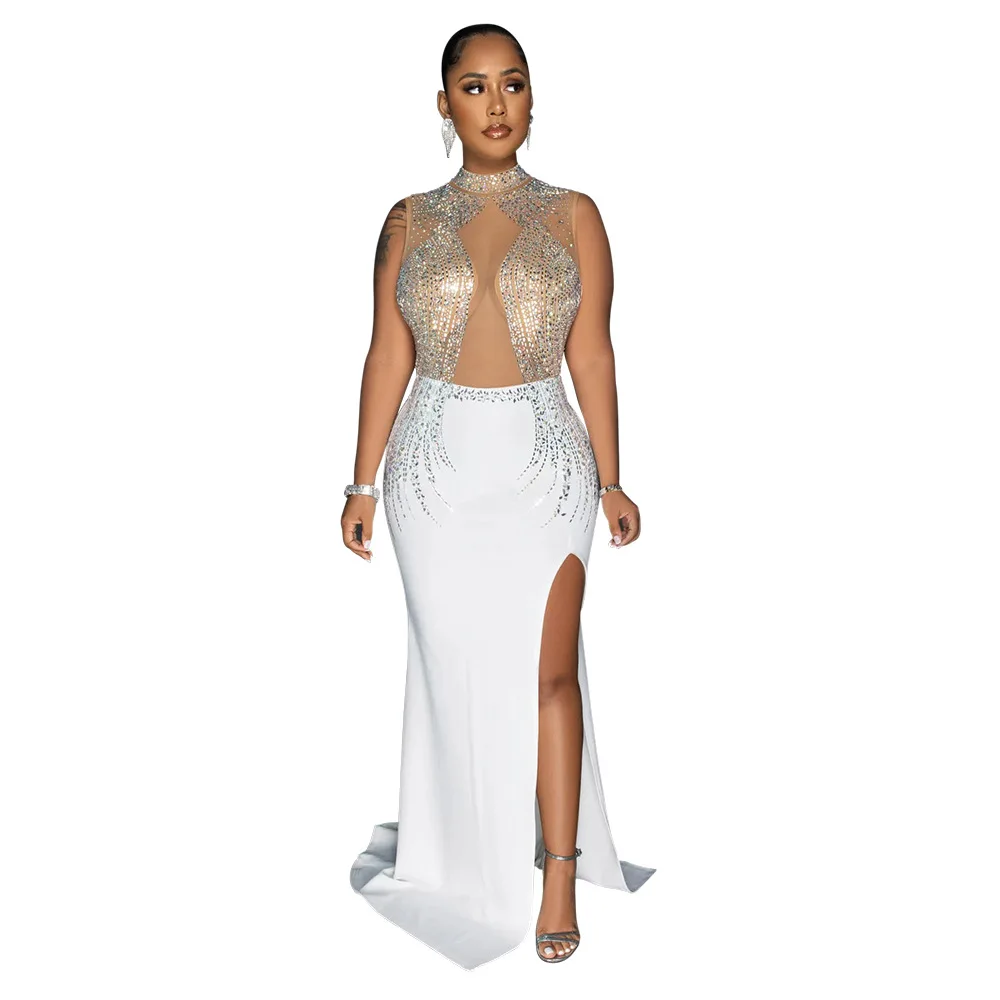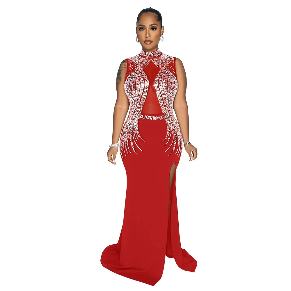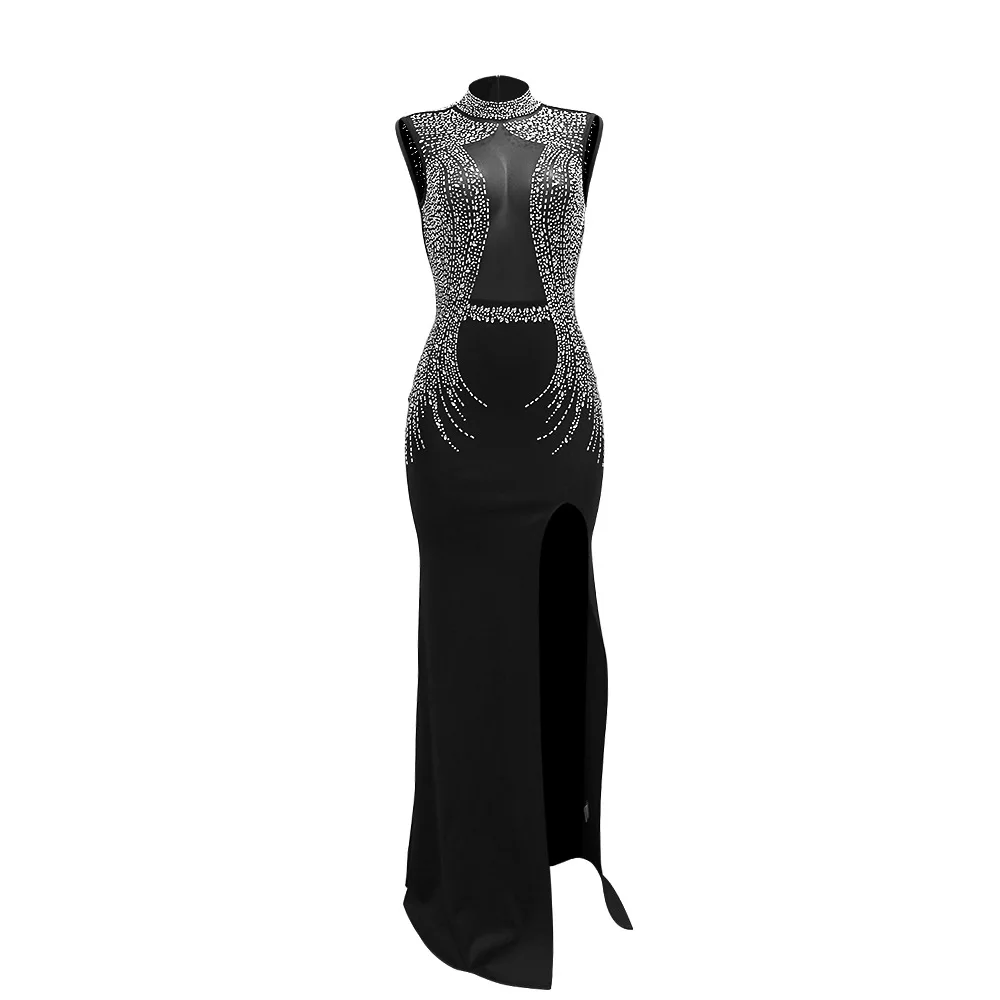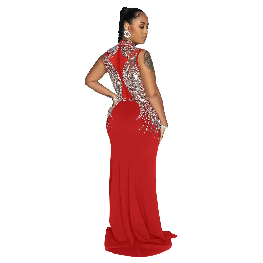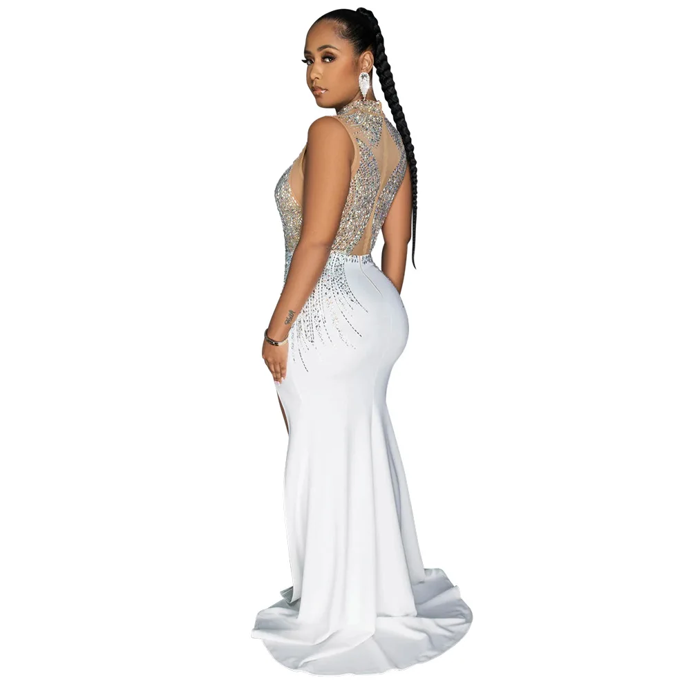 Round-Neck High-Slit Solid-Colour Hot Diamond Party Long Dress