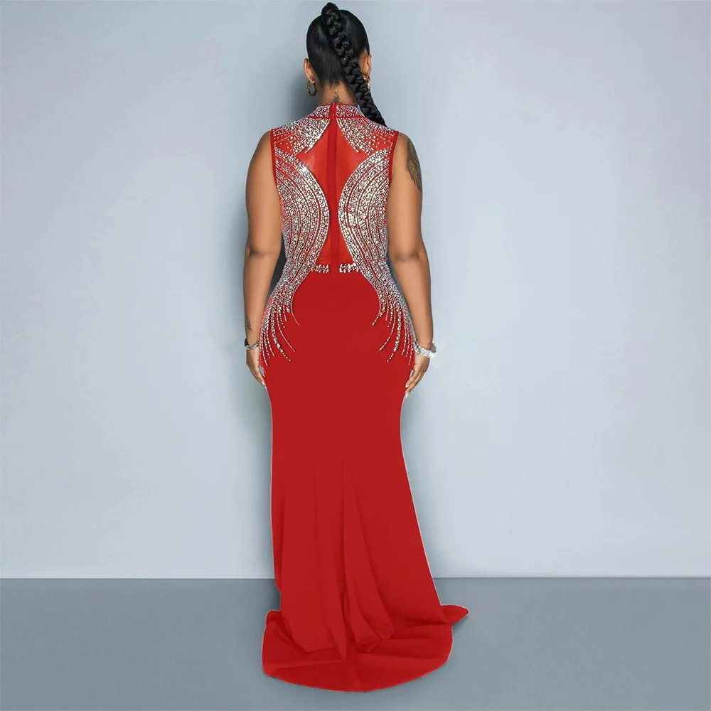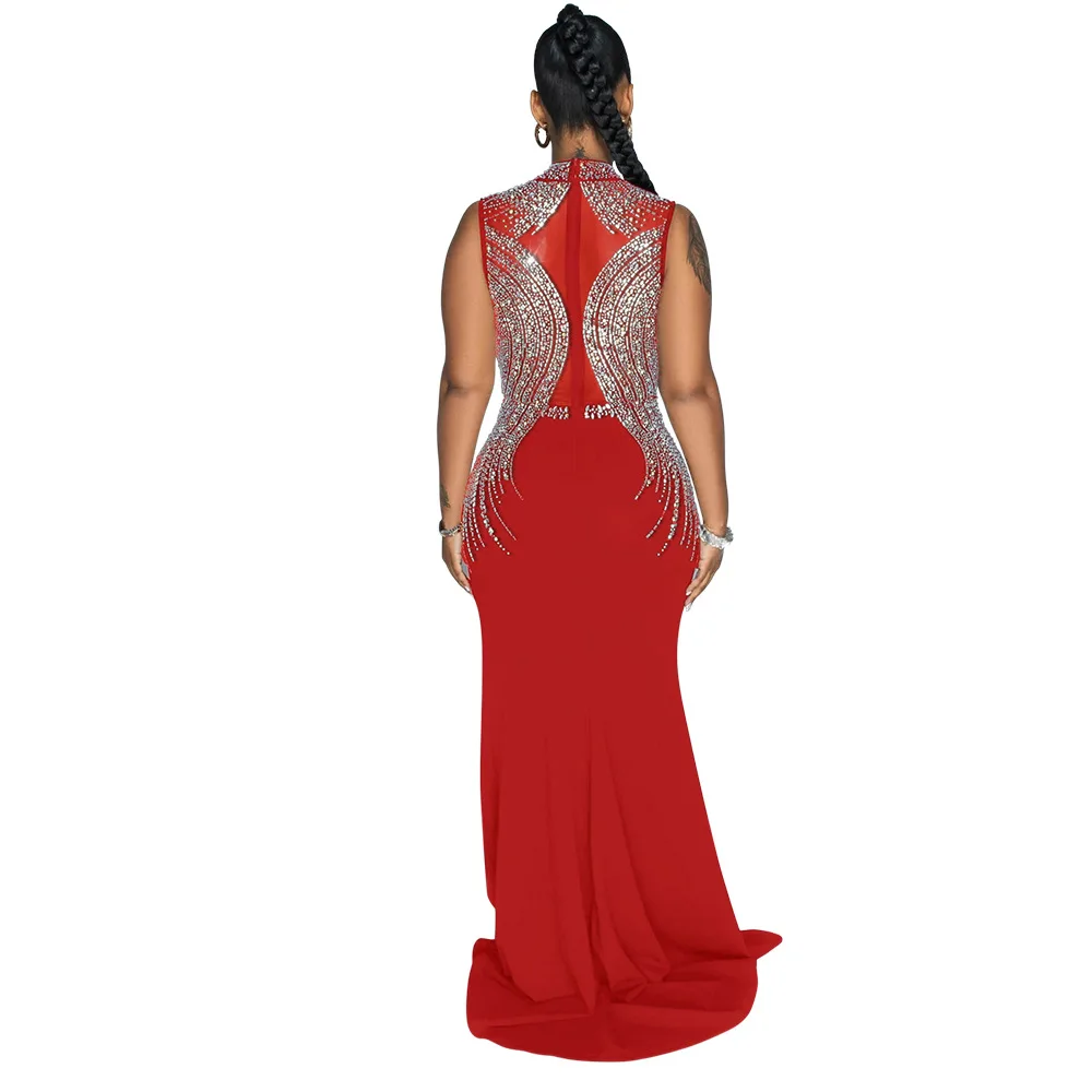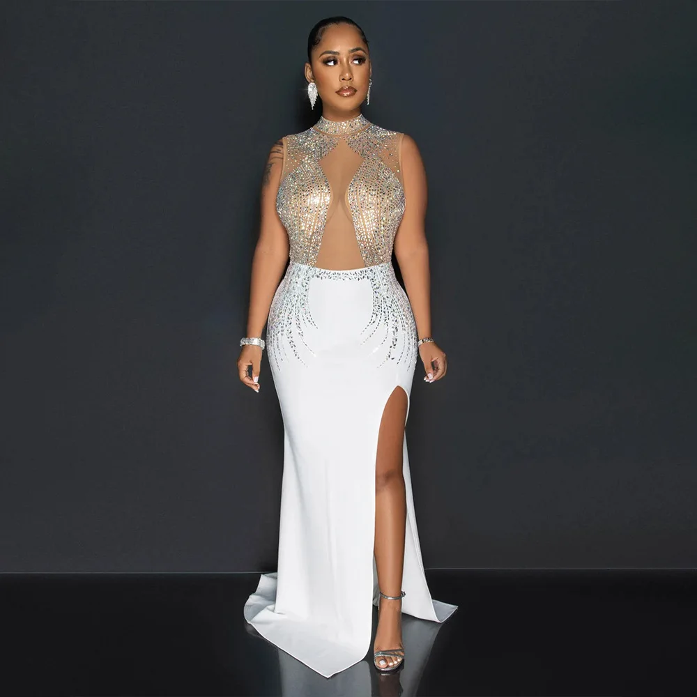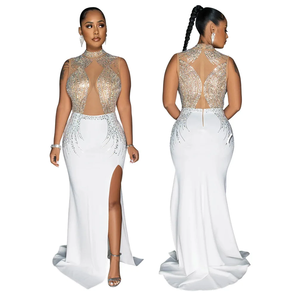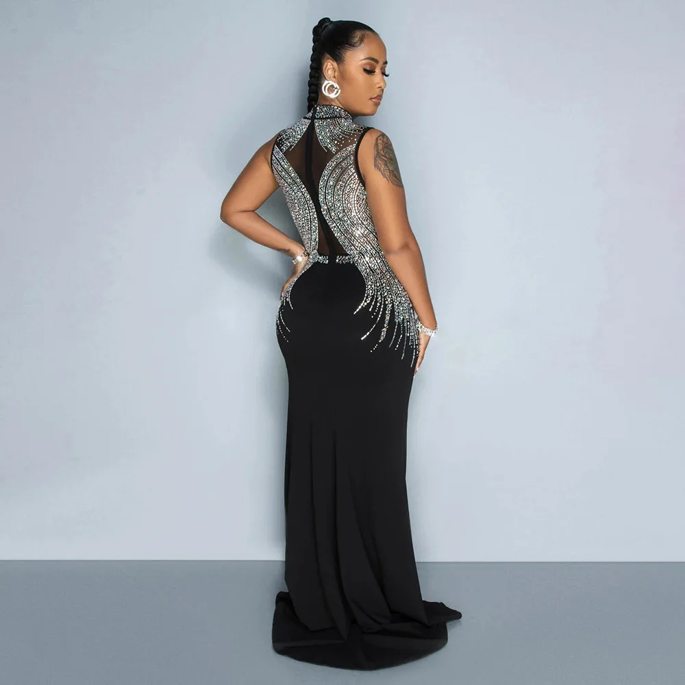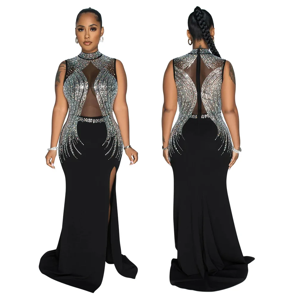 Round-Neck High-Slit Solid-Colour Hot Diamond Party Long Dress