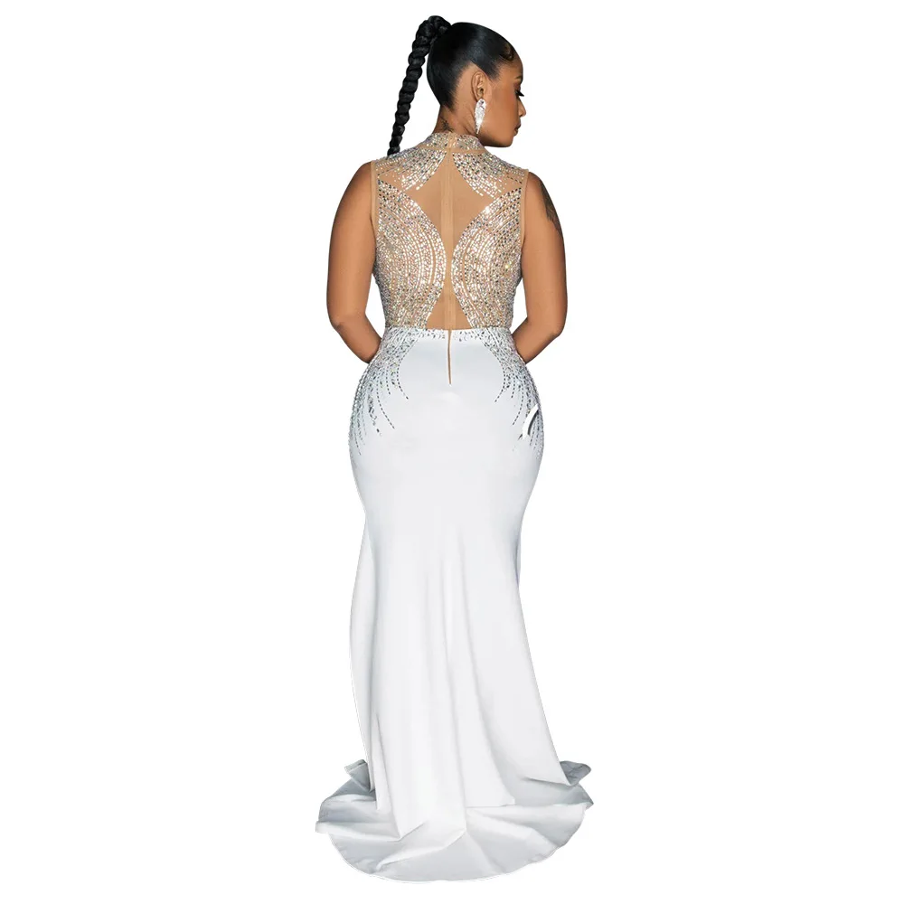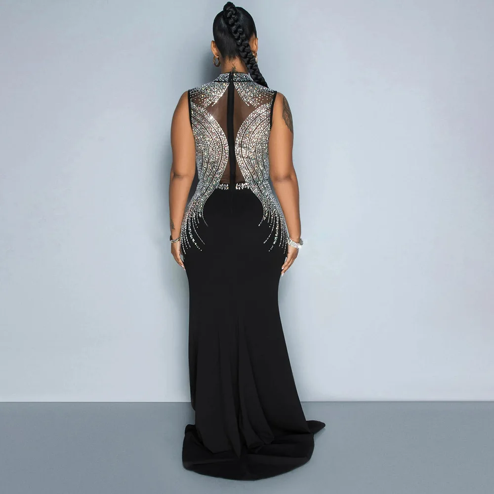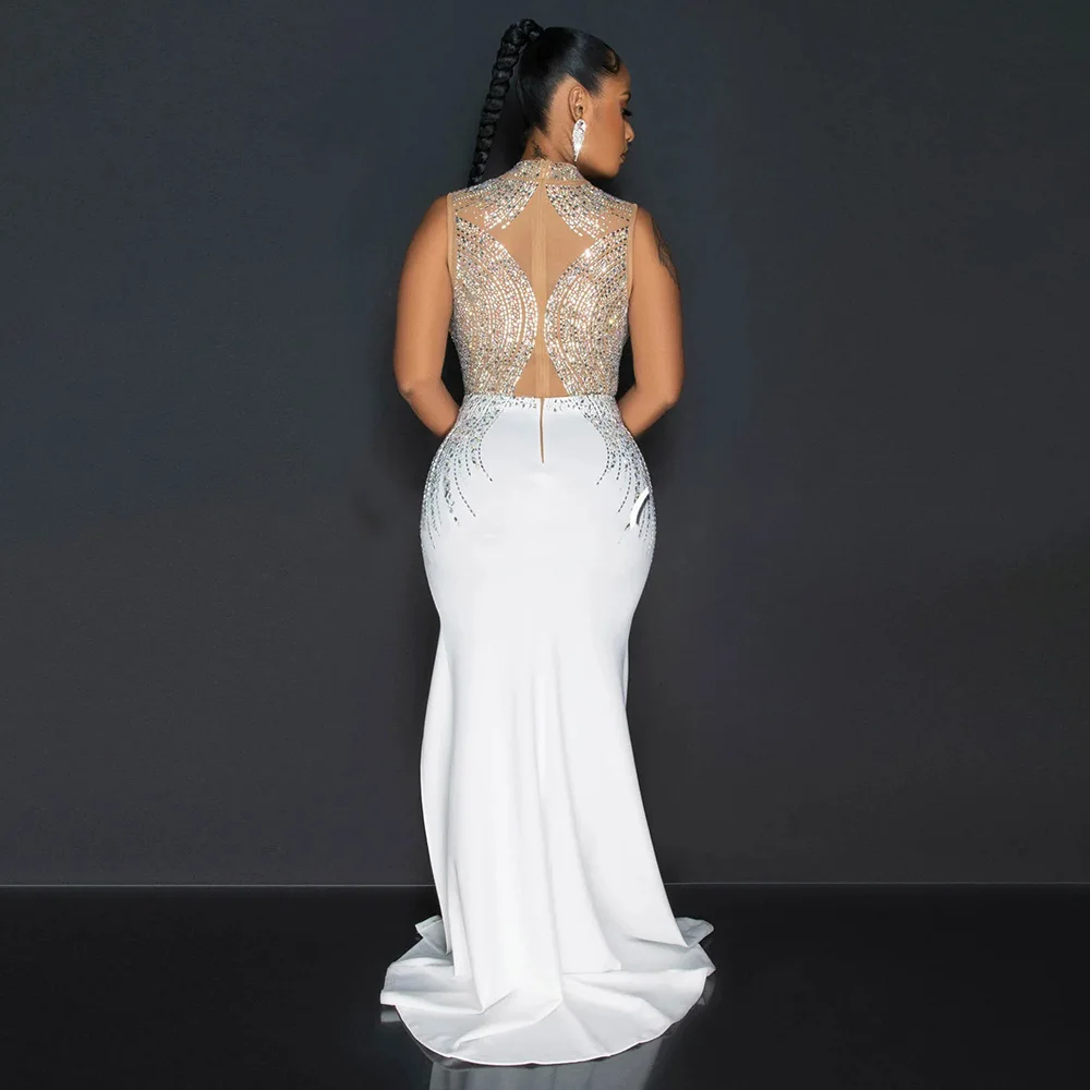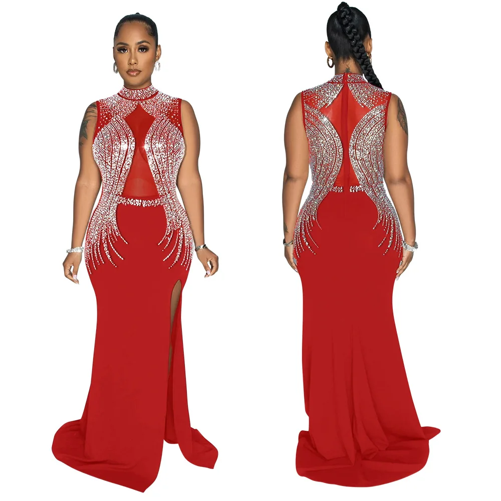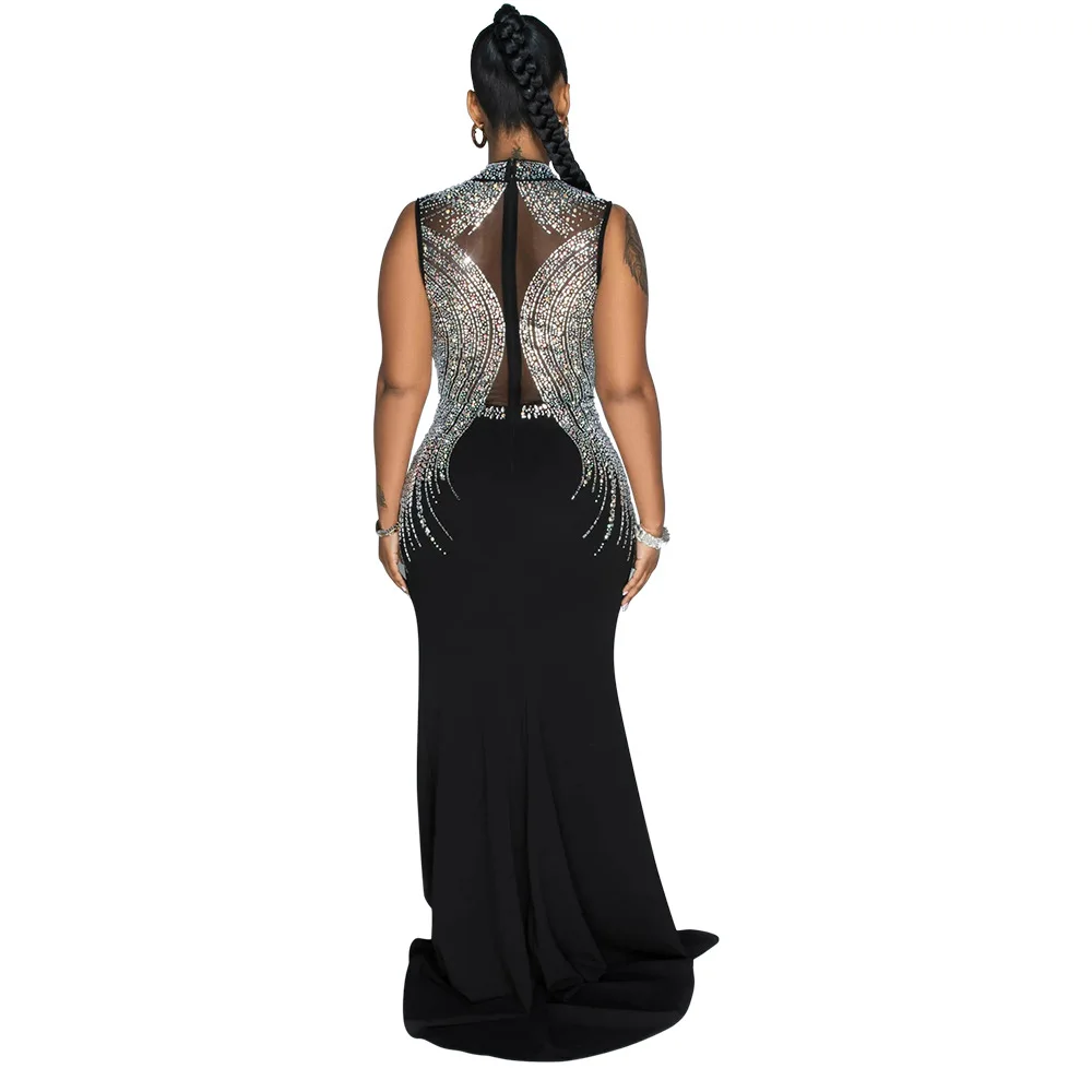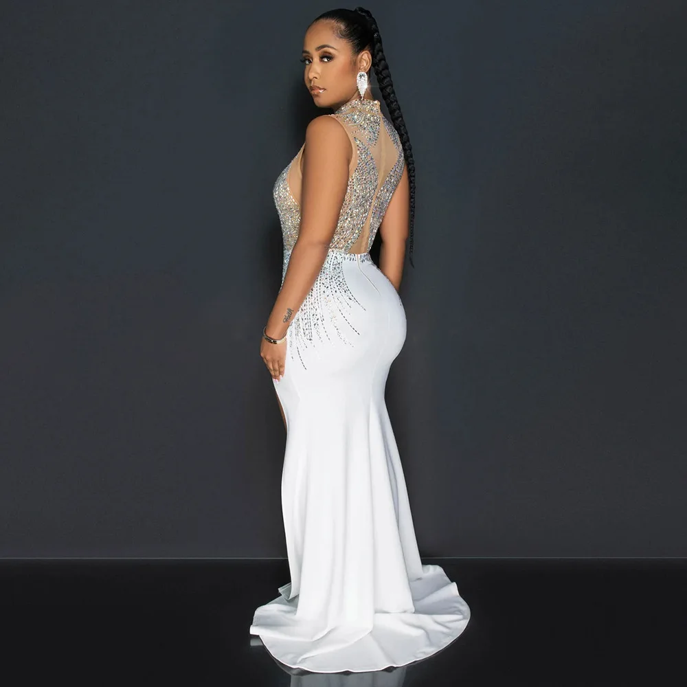 Round-Neck High-Slit Solid-Colour Hot Diamond Party Long Dress