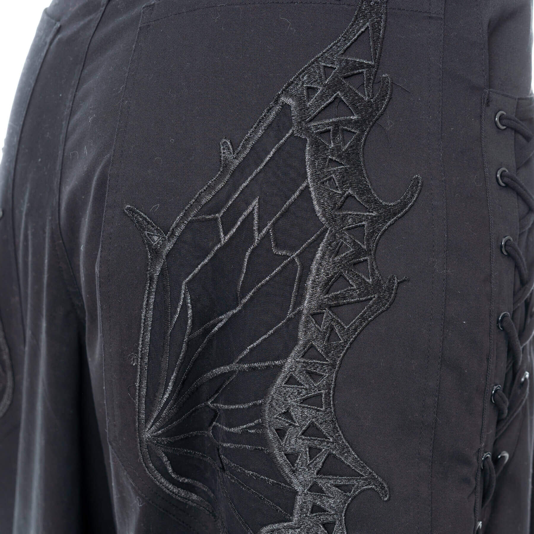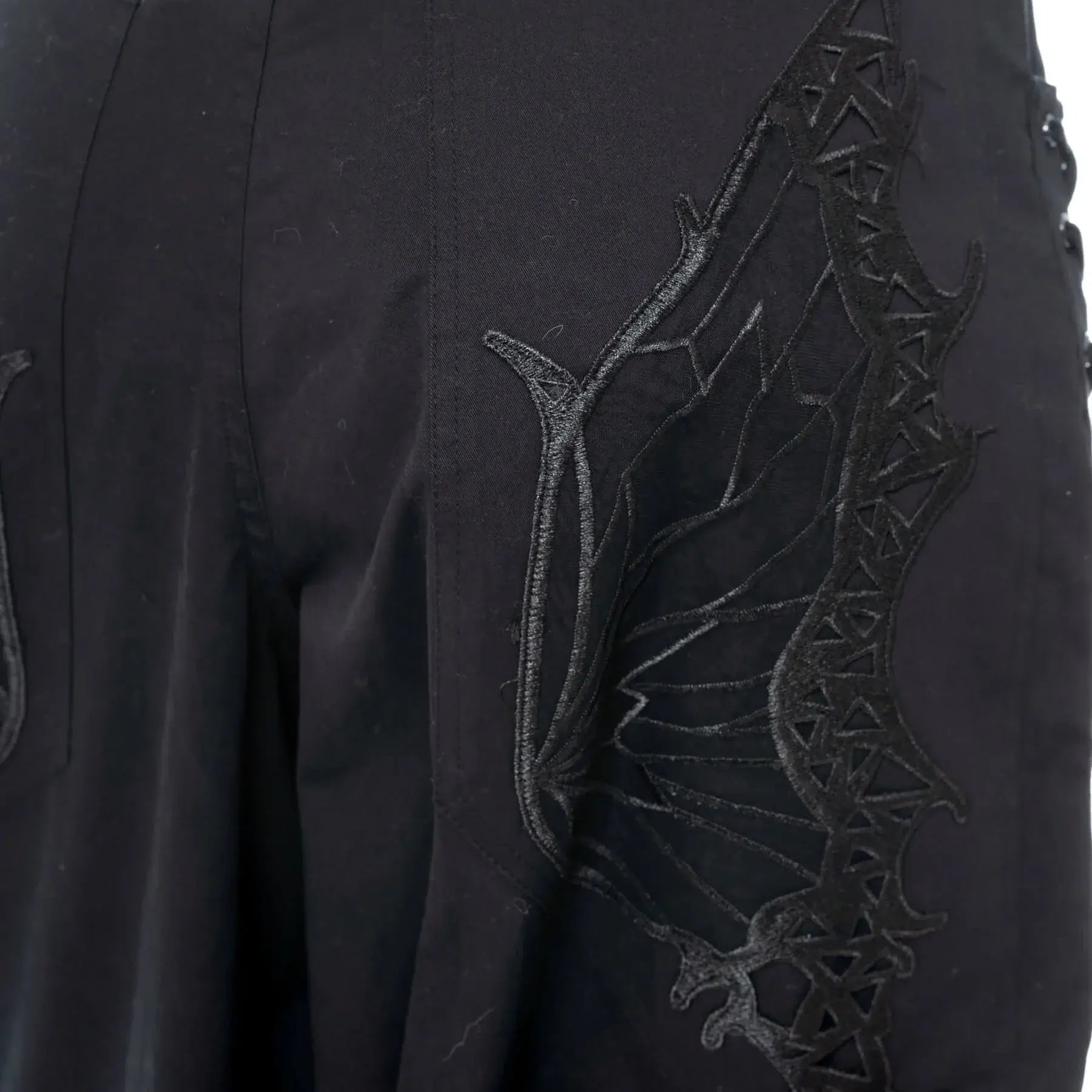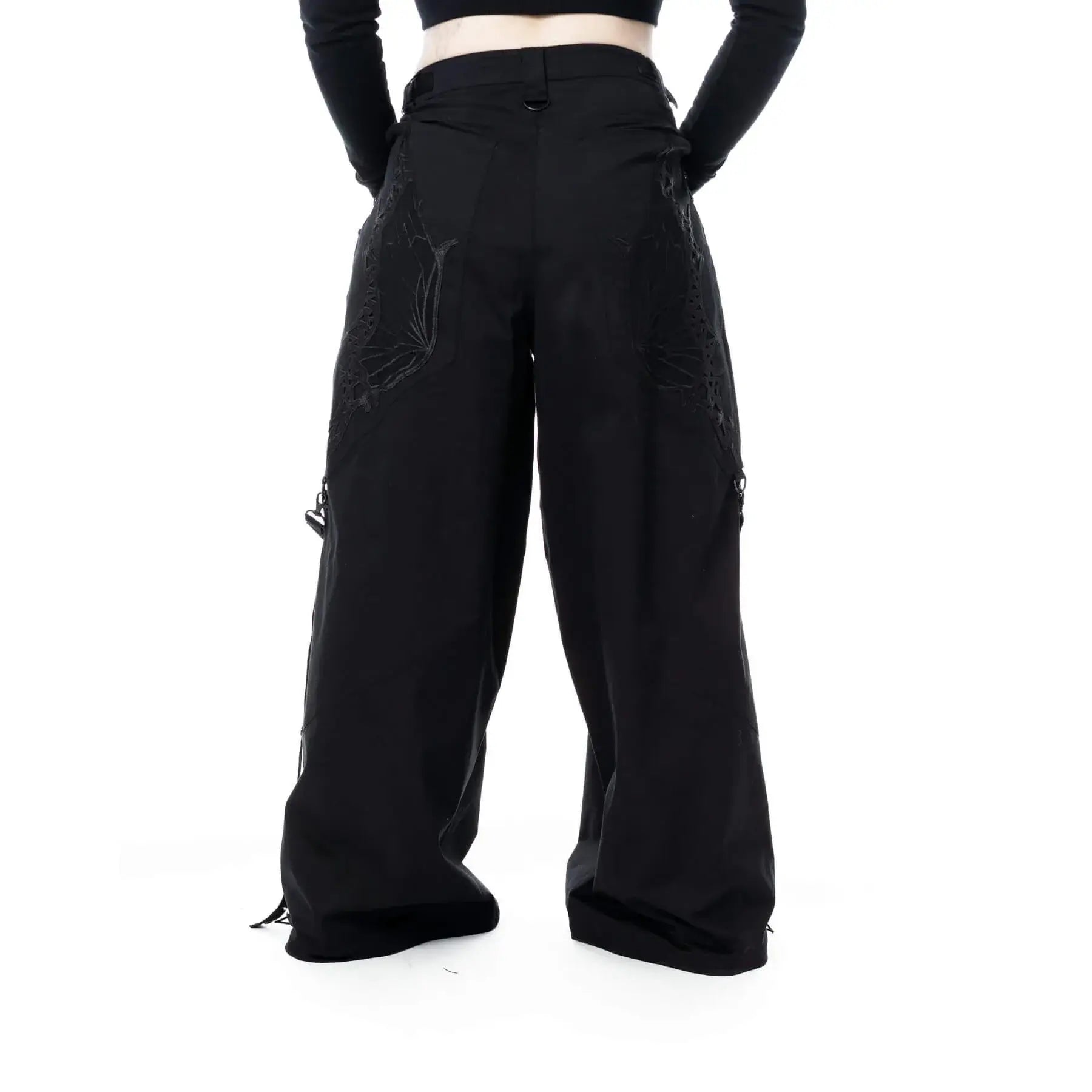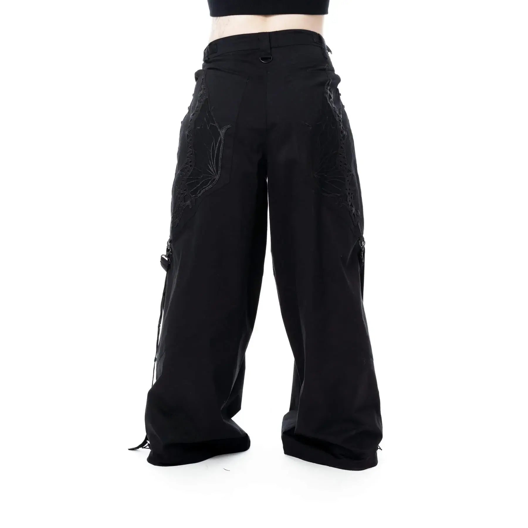 Upgrade your alternative streetwear game with our Vixxsin Mariposa Pants.These black wide-leg trousers feature a high-waisted fit with a tailored look and oversized silhouette for a dramatic, edgy vibe. Embroidered butterfly wing designs and functional hardware details add a unique gothic touch. Adjust the hems and pair with platform boots for a customised, standout look.