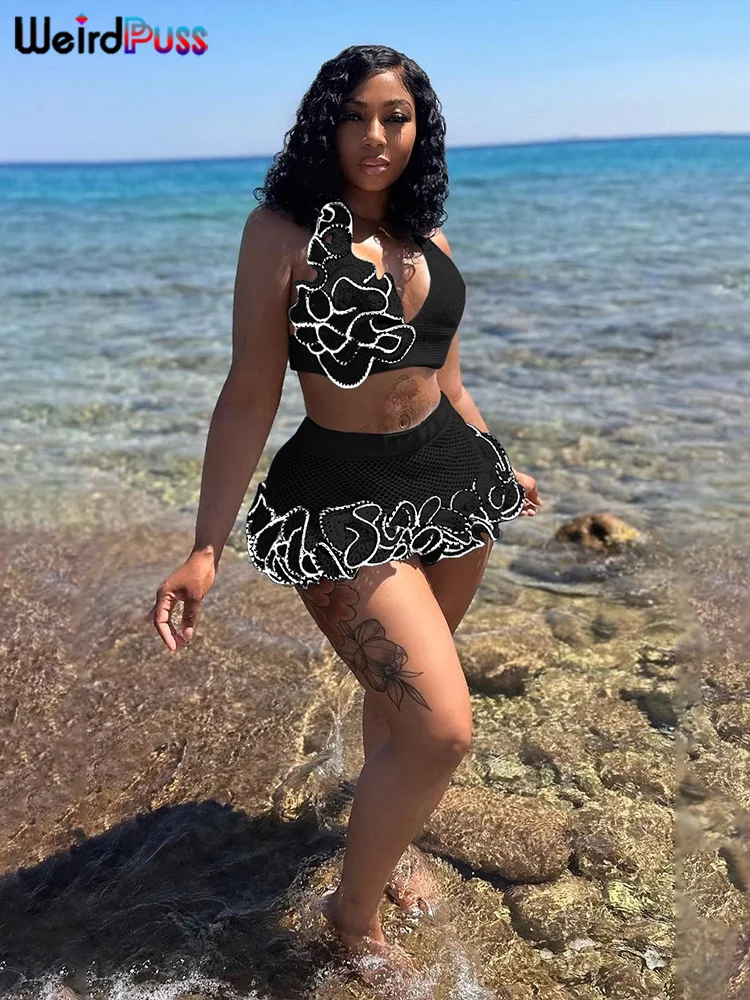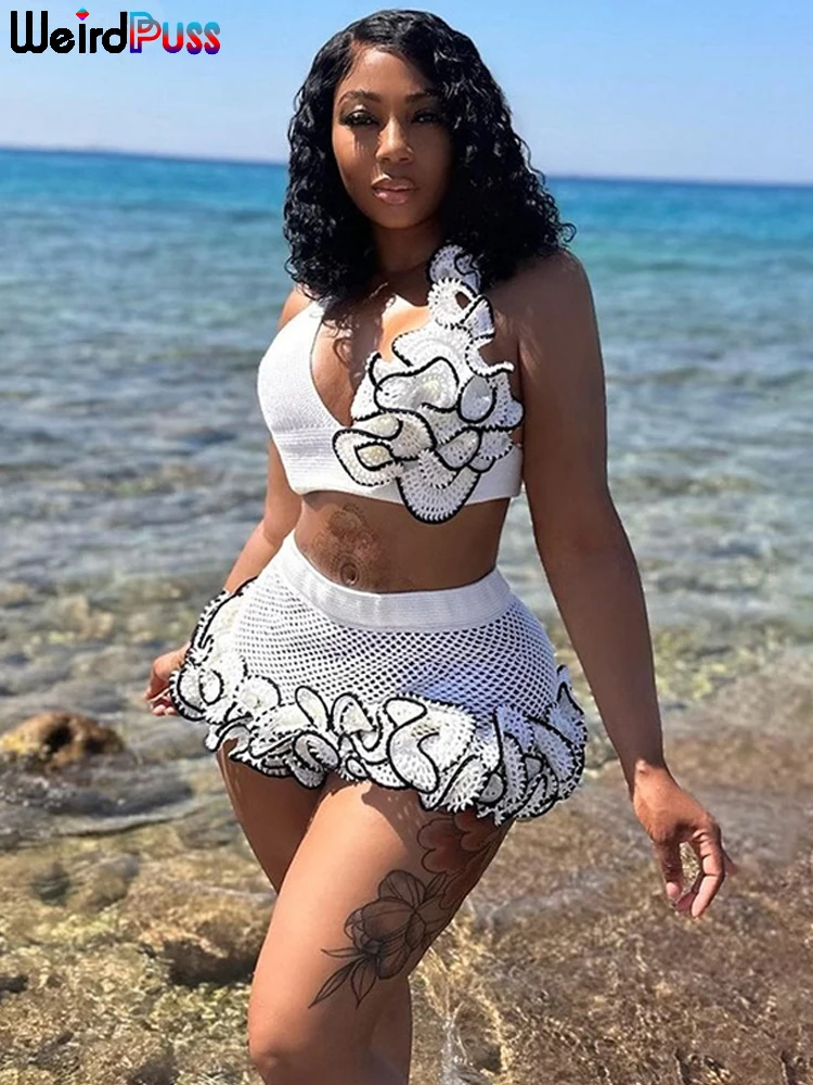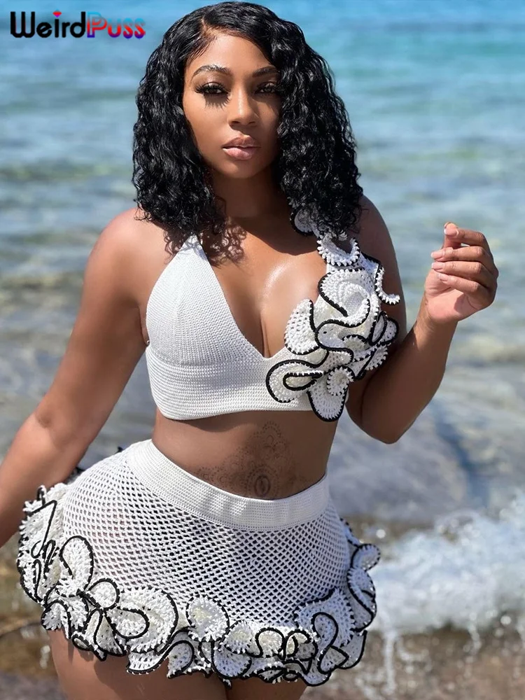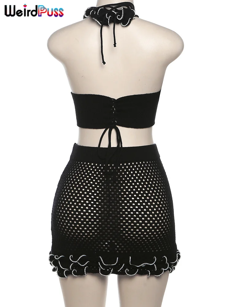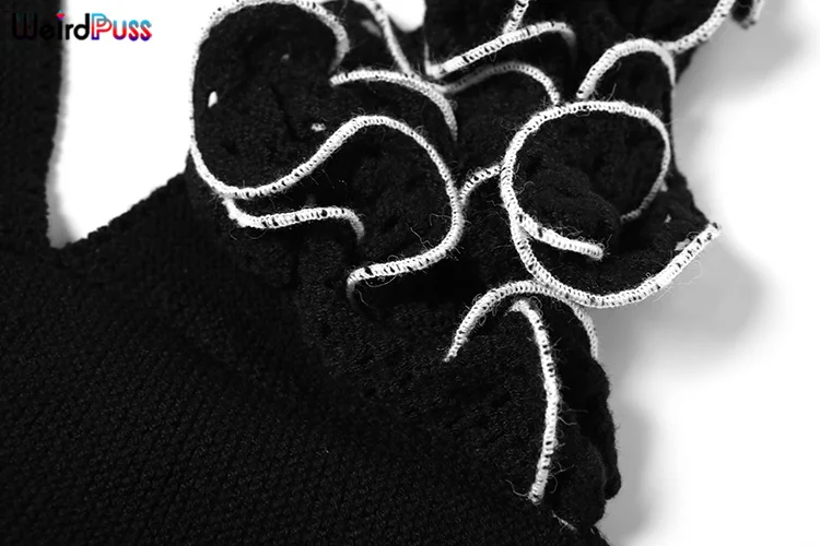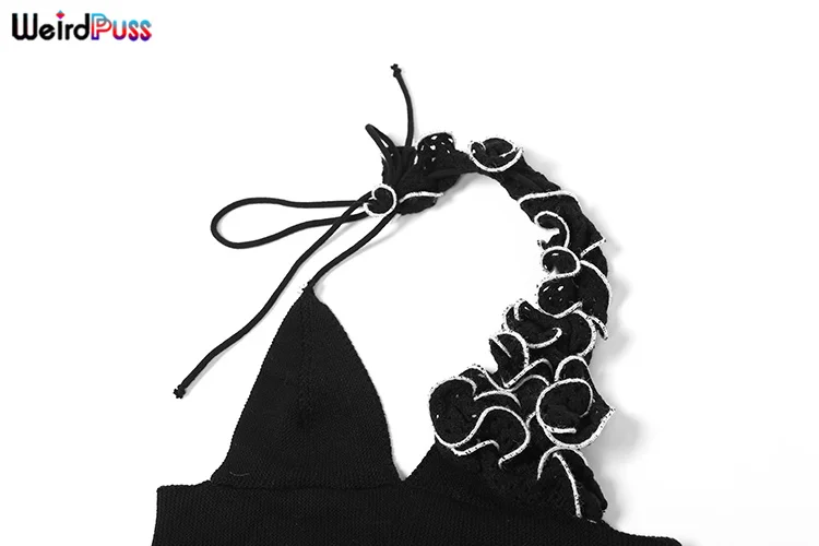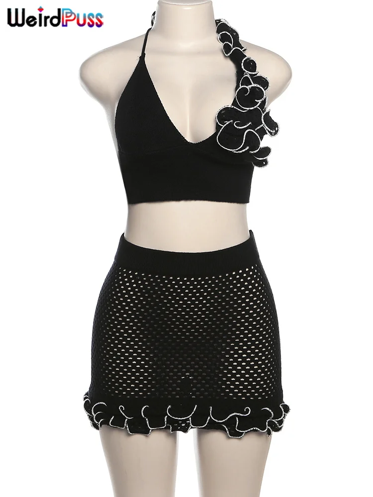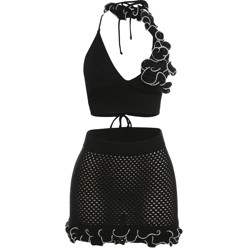 Chic Knit 2-Piece Set - Skinny Halter Deep V-Neck Flowers Camisole Top + Multi-Layered Hem Skirt