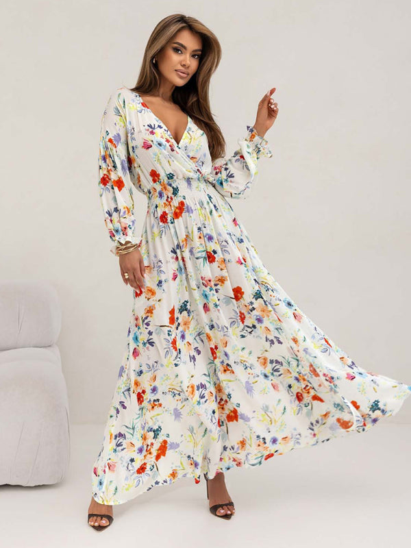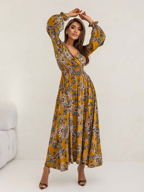 Women's Printed V-Neck Sexy Slit Long Sleeve Dress